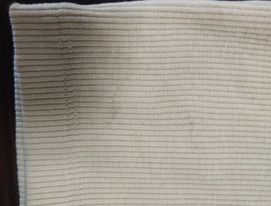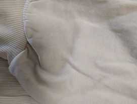 - defekt zabrudzenia materiału oraz niewielkie odbarwienia materiału na rękawie