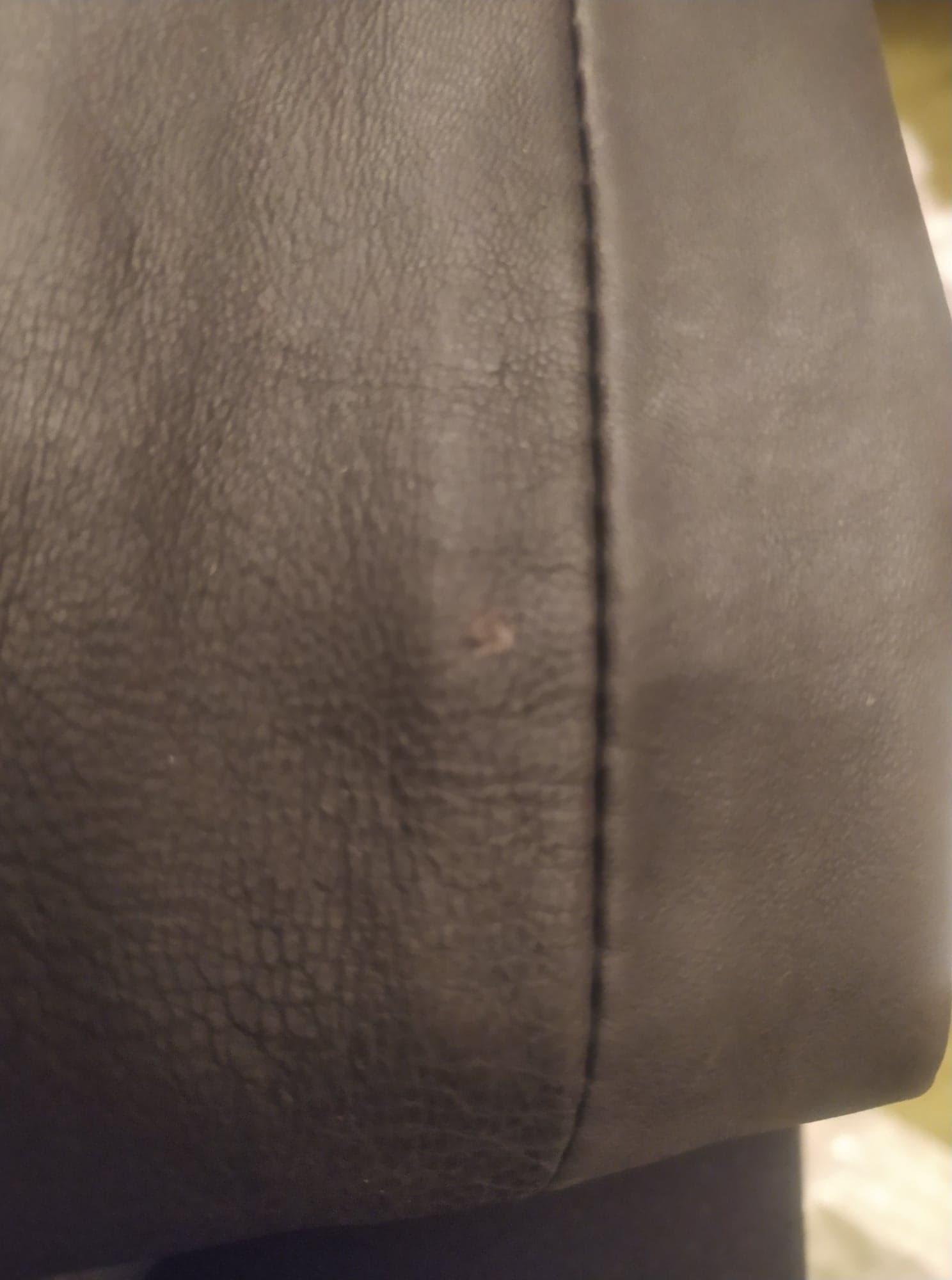 - Defekt: przytarta, przydarta skóra na lewym rękawie przy wewnętrznym szwie (zdjęcie)
