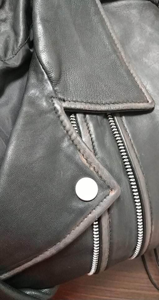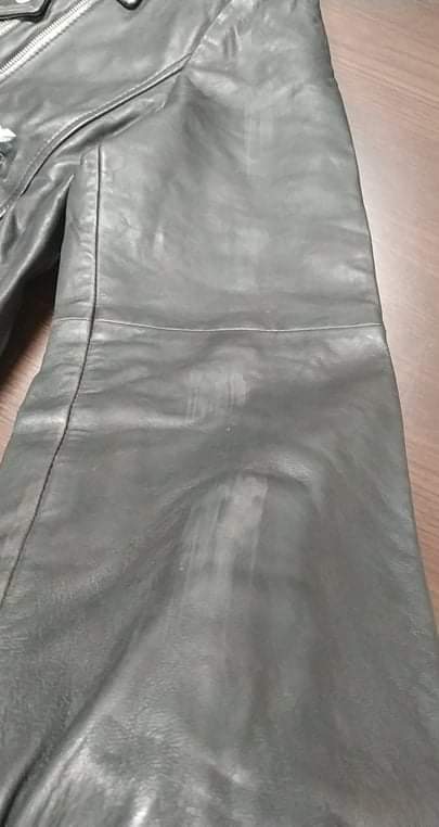 - defekt przetarcia na rękawach i pomarańczowe zabarwienie przy szwach