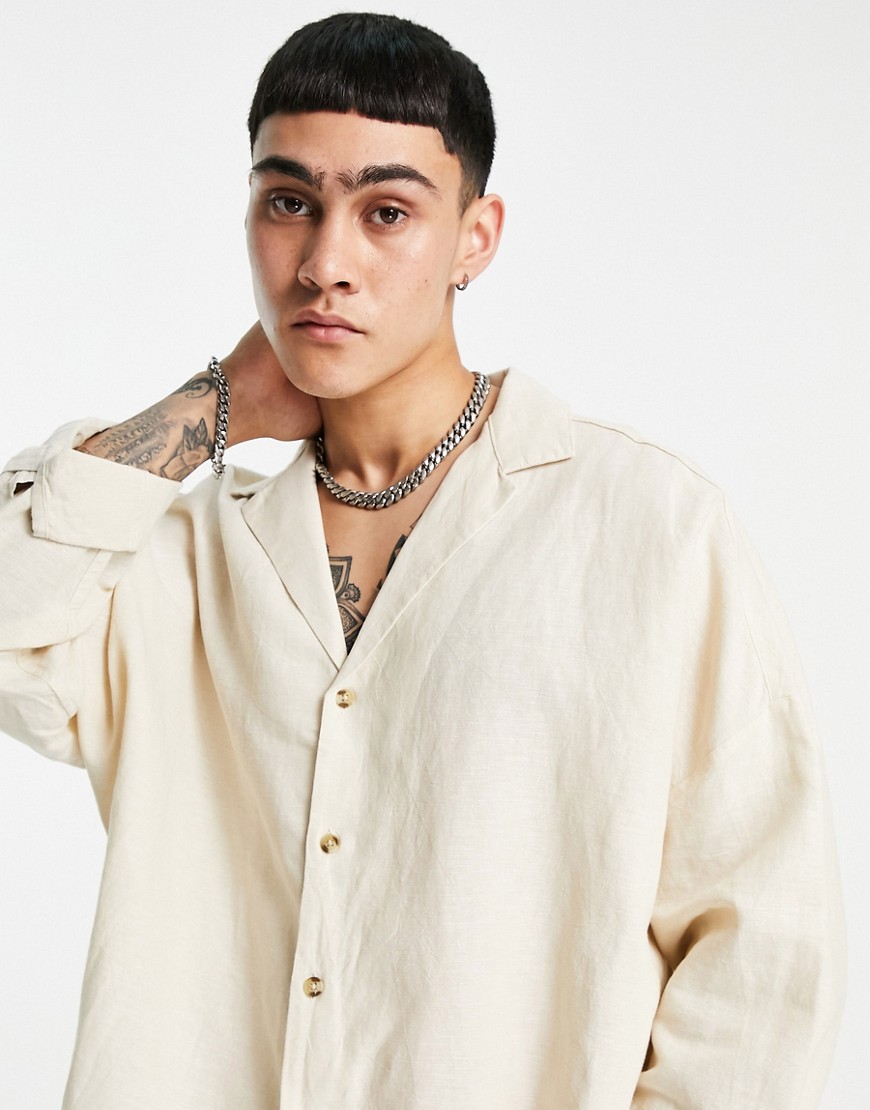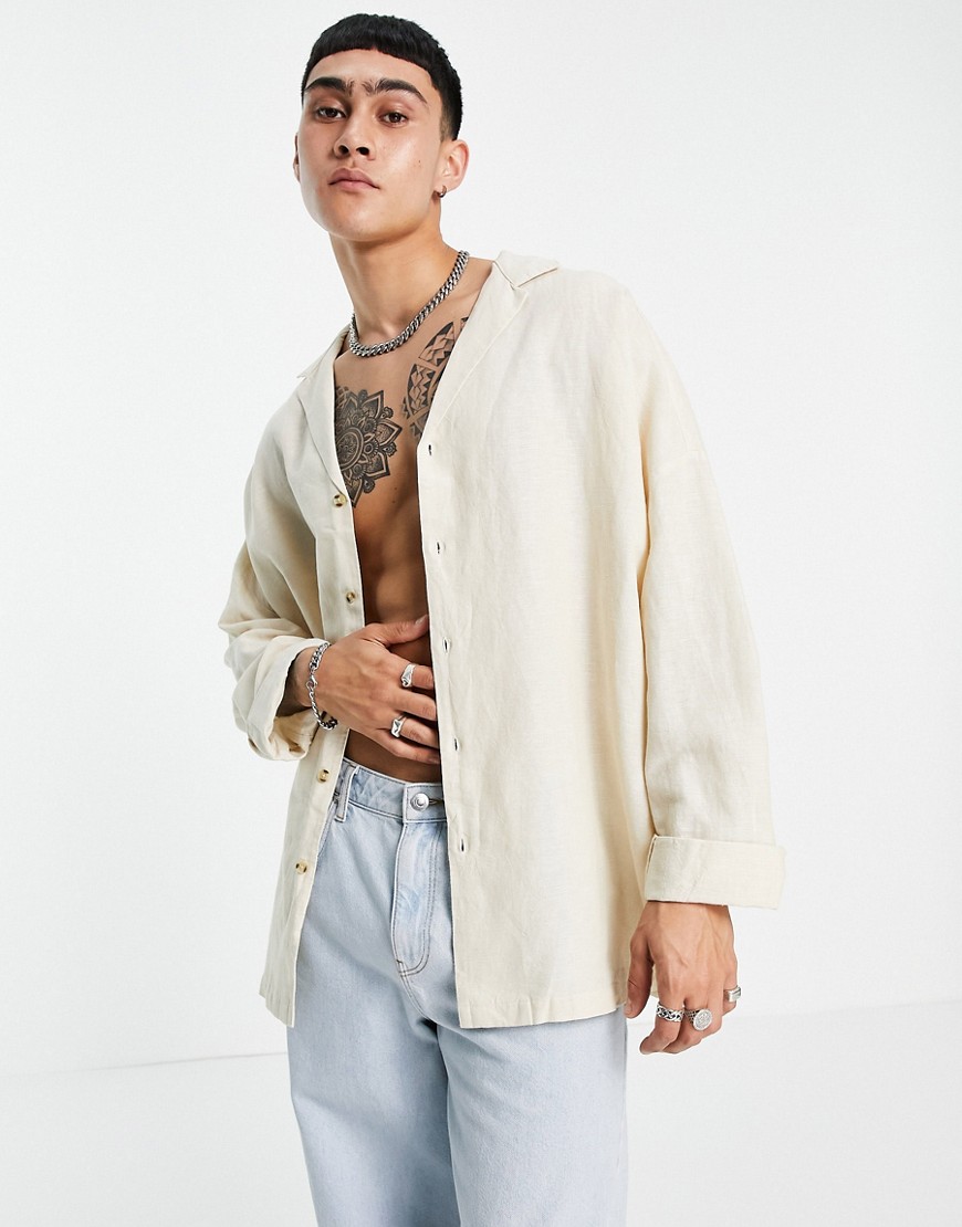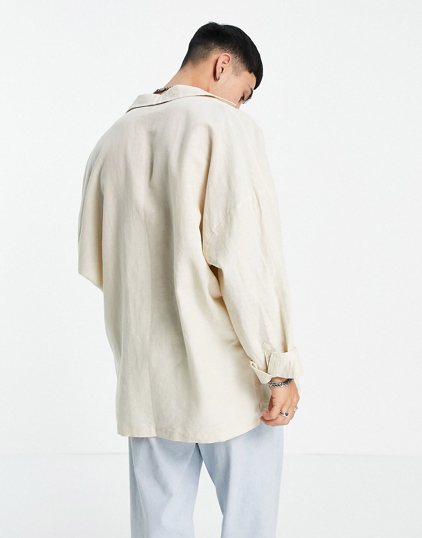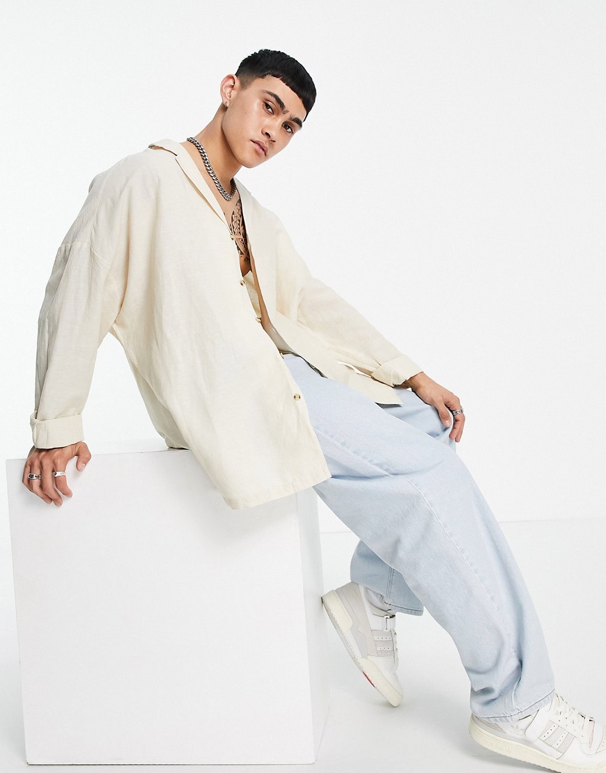 Beżowa męska lniana koszula oversize z kubańskim kołnierzykiem S