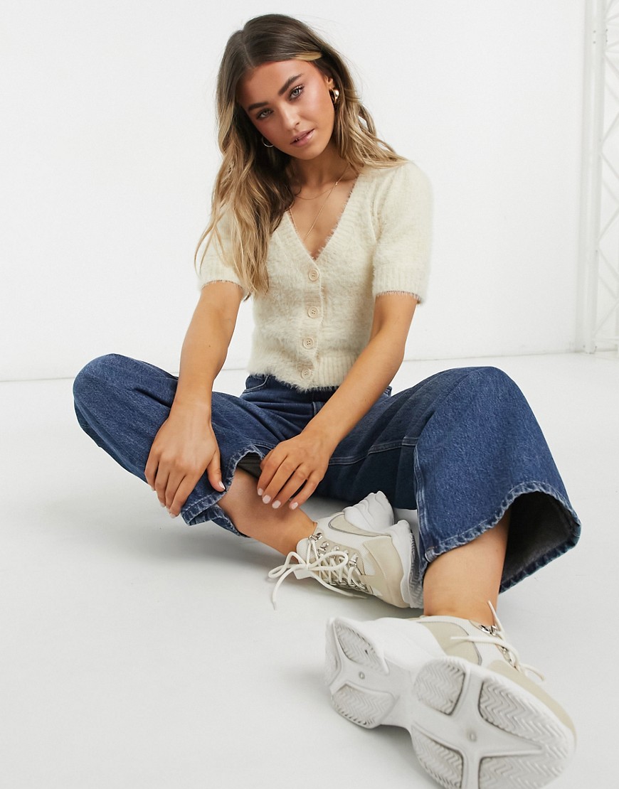 Beżowy puszysty miękki kardigan z krótkim rękawem na guziki 40