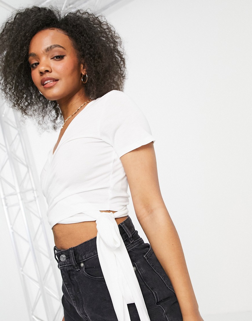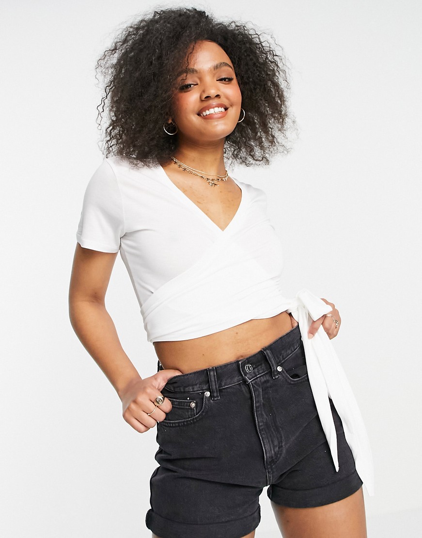 Biała bluzka kopertowa krótki rękaw wiązana basic 40