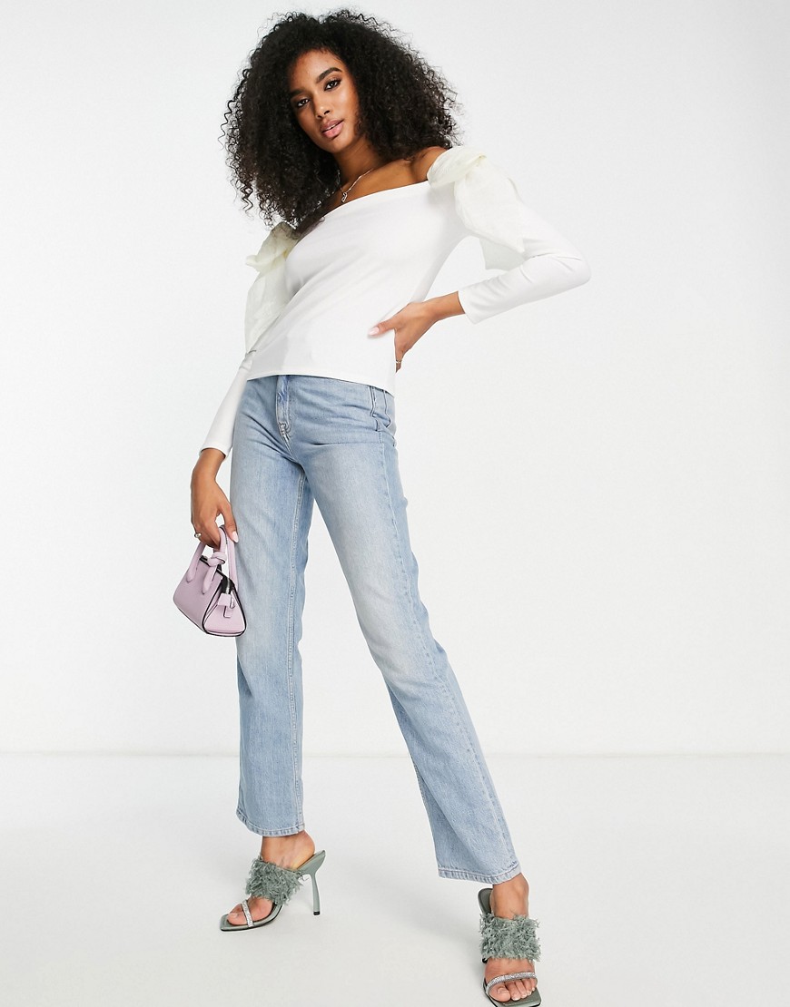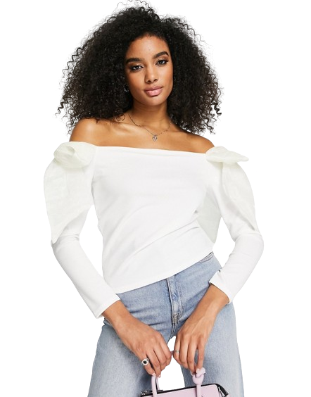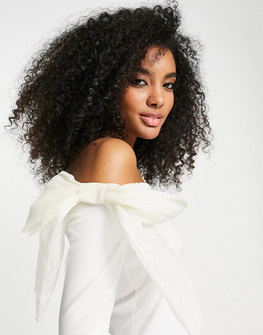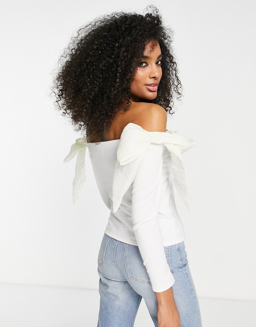 Biała bluzka z dekoltem bardot i kokardami z organzy 40
