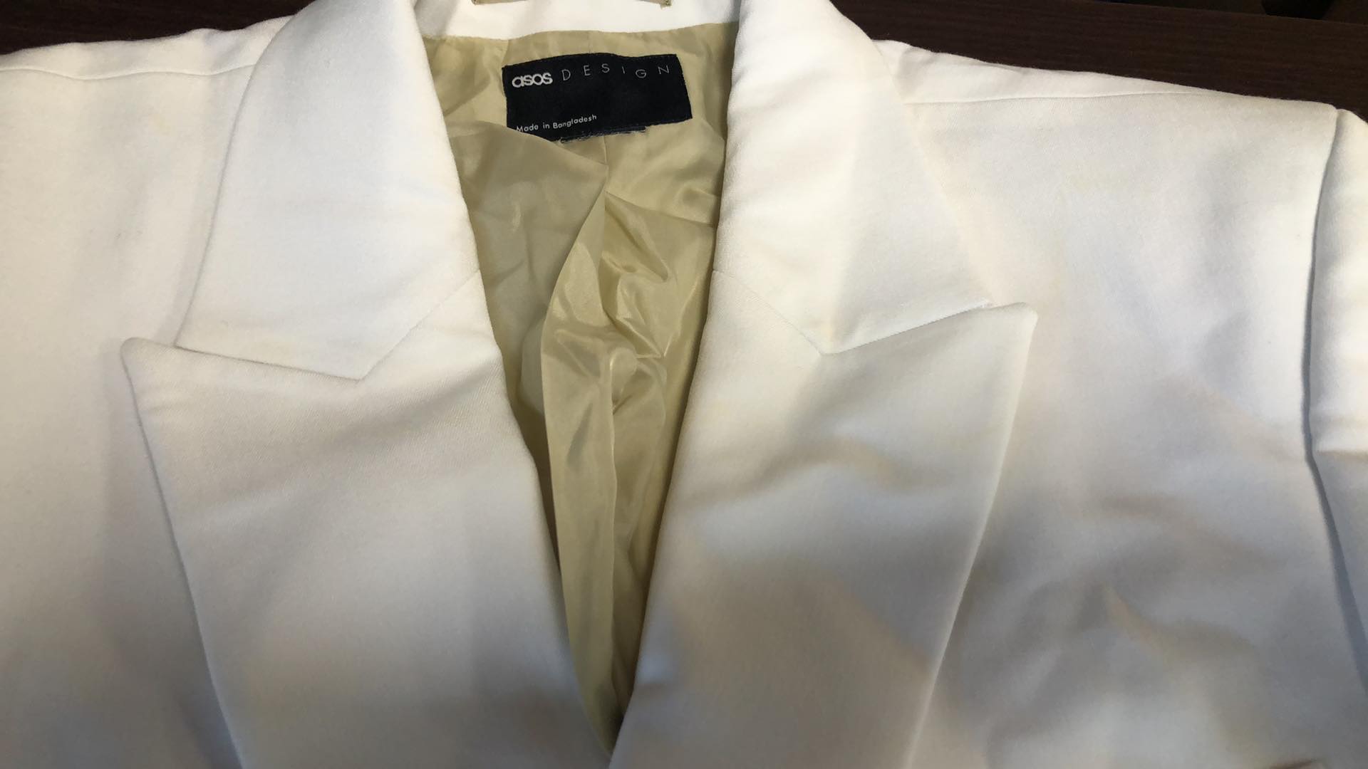 - Defekt żółte zacieki na całości, zabrudzenie przód kołnierz, ramiona, tył, zdjęcie w galerii produktu