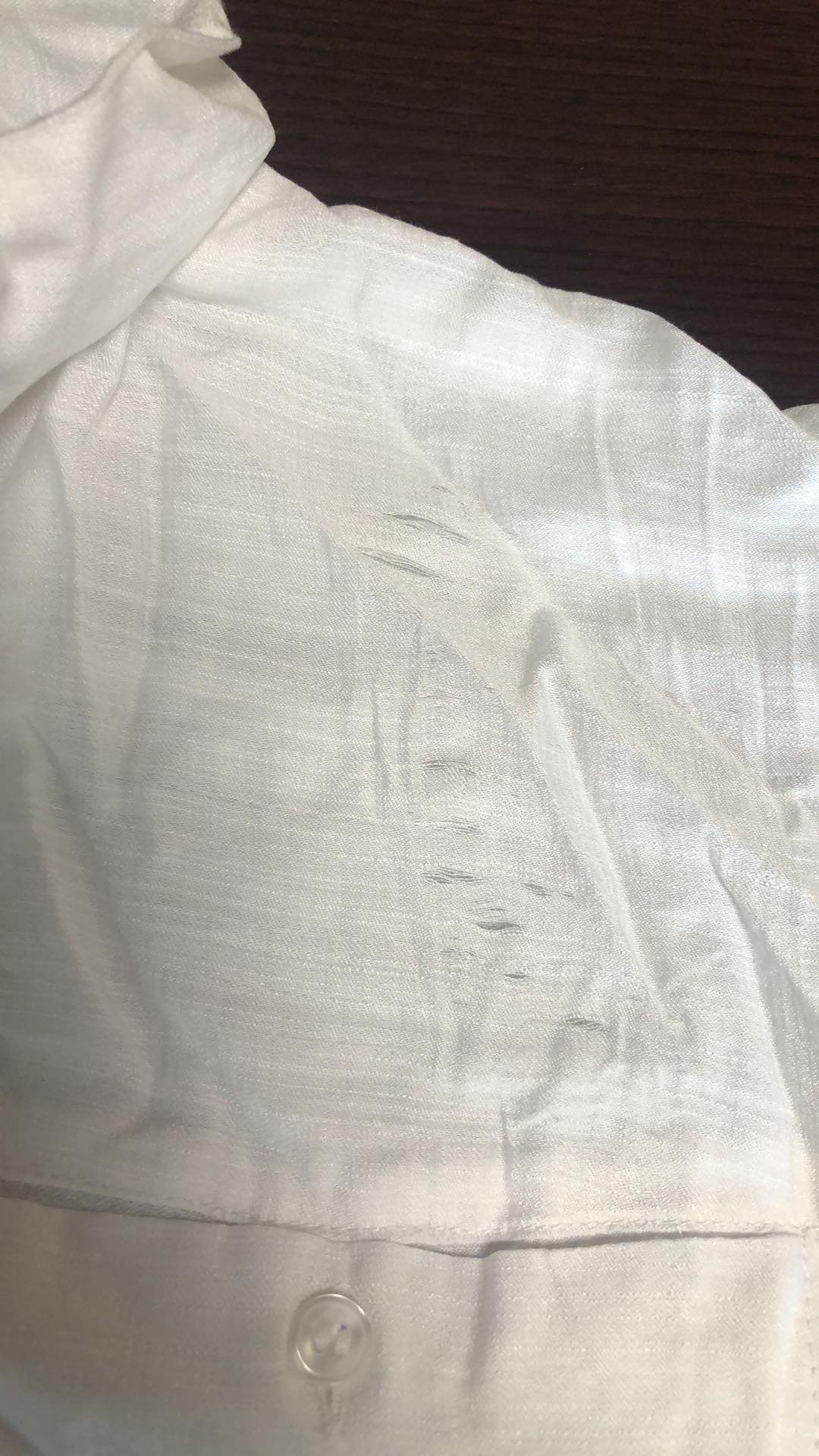 - Defekt: zaciągnięcie materiału z przodu przy kołnierzu, zdjęcie w galerii