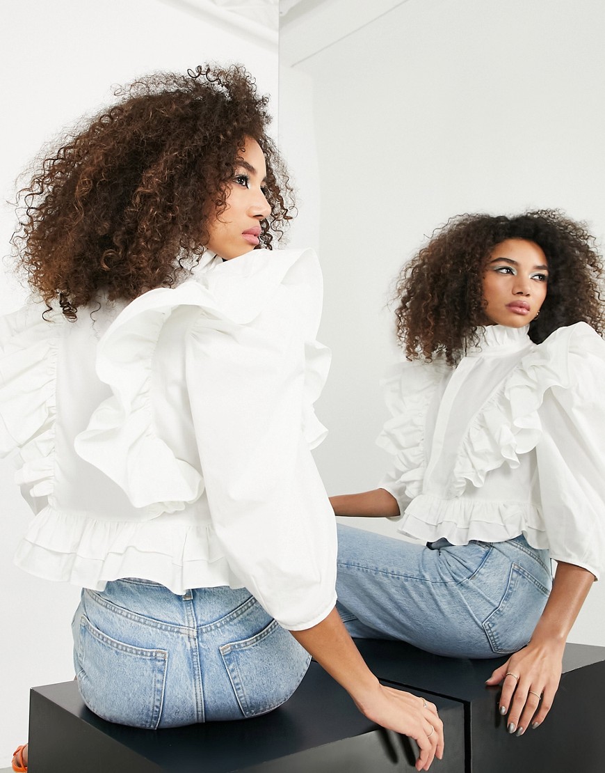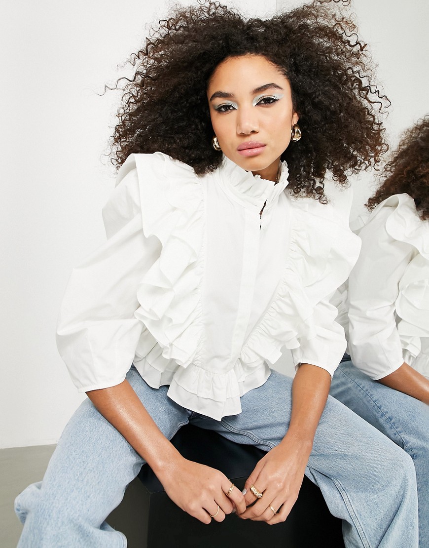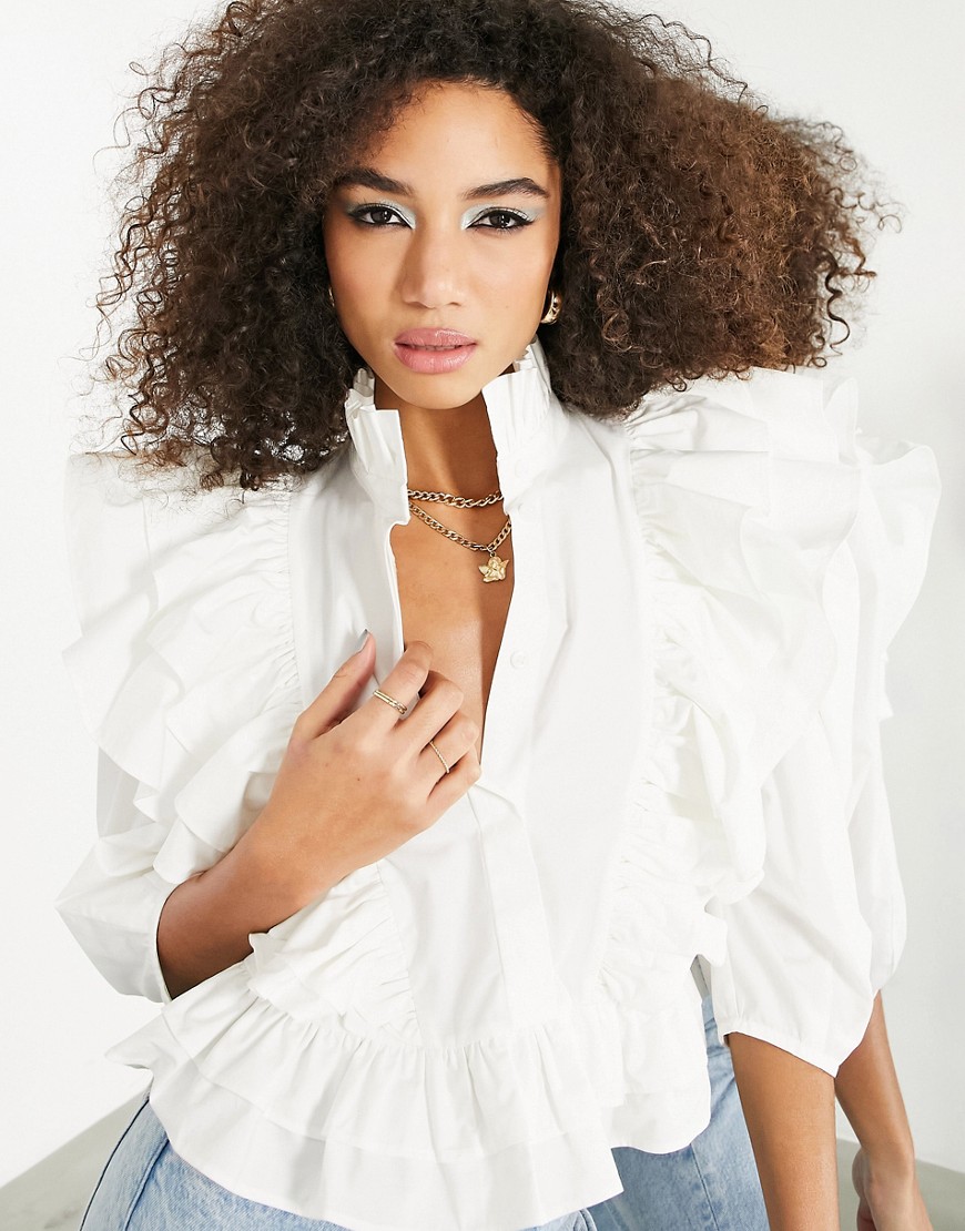 Biała koszula ze stójką i falbanką 38