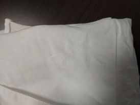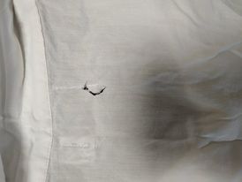 - defekt roztargany materiał z tyłu w miejscu szycia metki oraz niewielka dziurka z przodu po lewej stronie