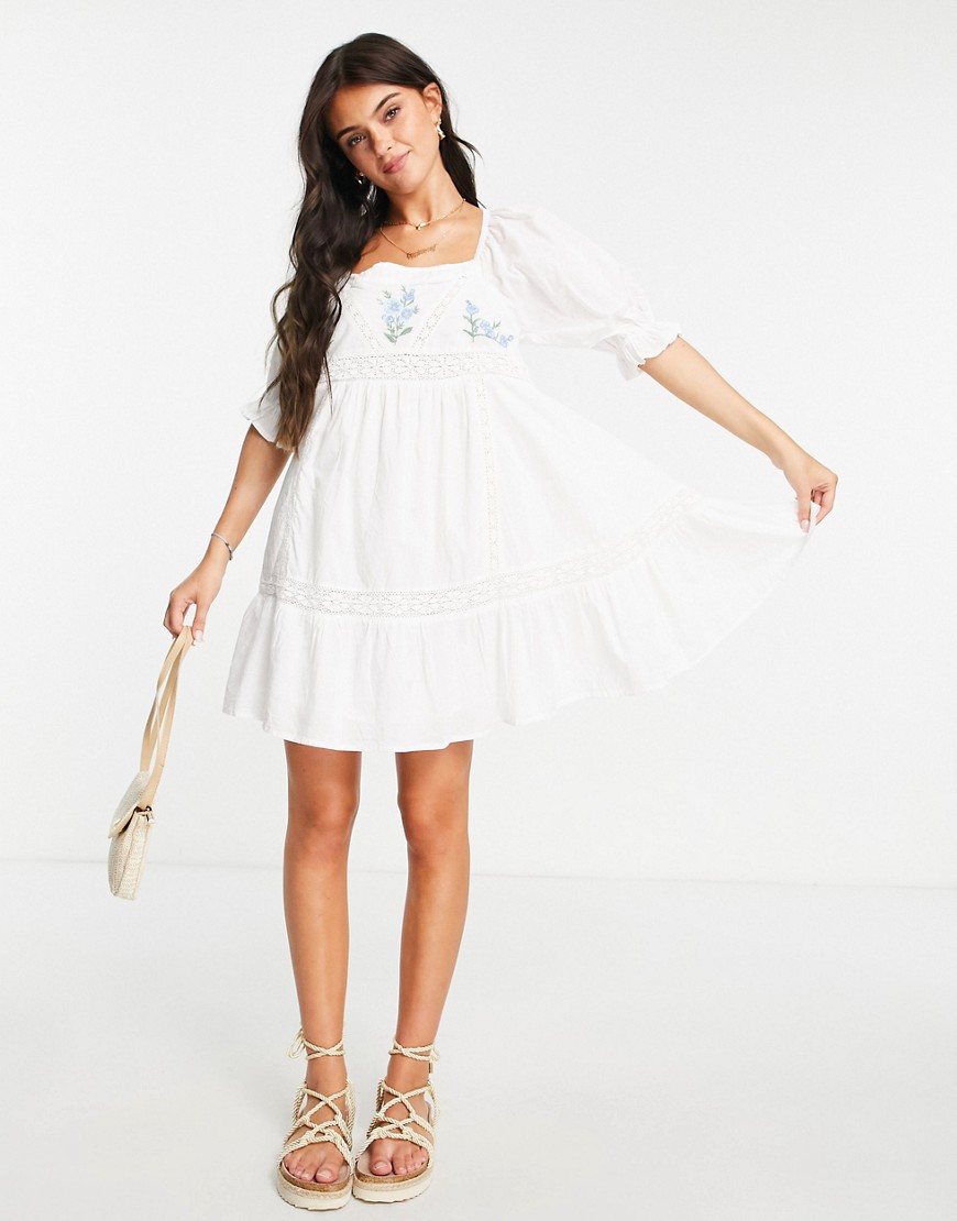 Biała luźna sukienka mini koronkowe wstawki kwiatowy haft 38