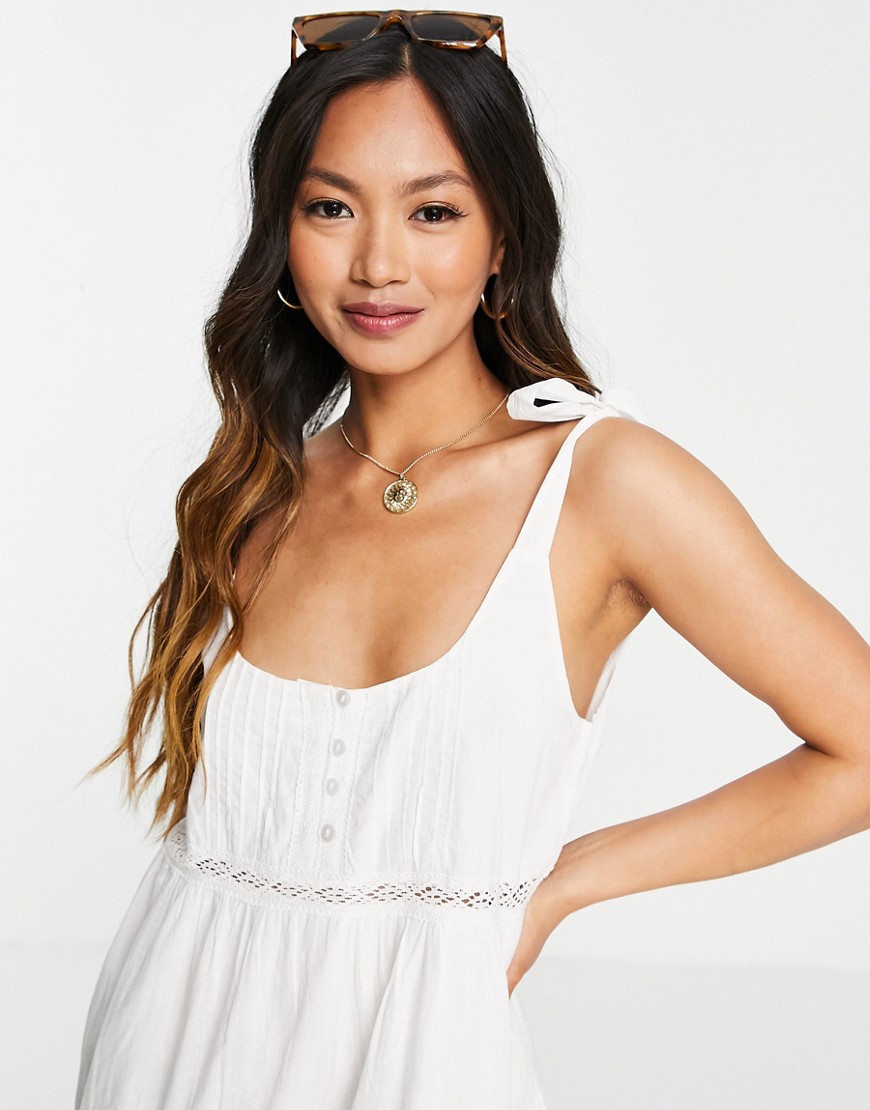 Biała sukienka letnia mini wiązanie na ramieniu koronkowa wstawka 36