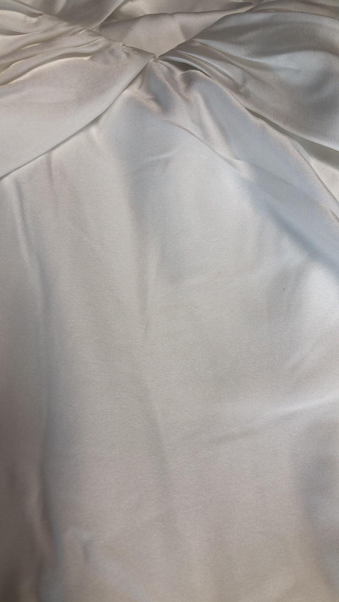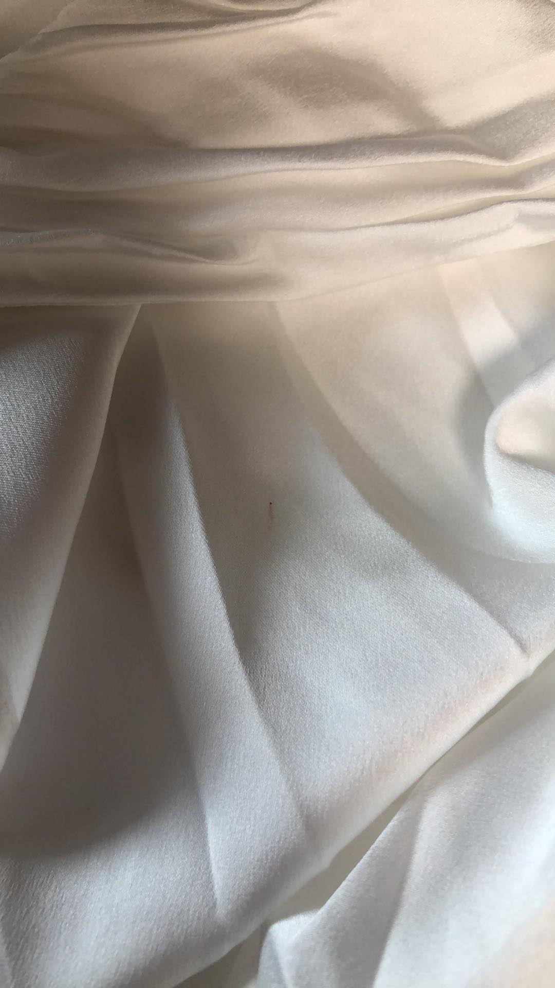 - Defekt: zabrudzenie materiału pod dekoltem oraz koło zapięcia z tyłu, zdjęcia w galerii