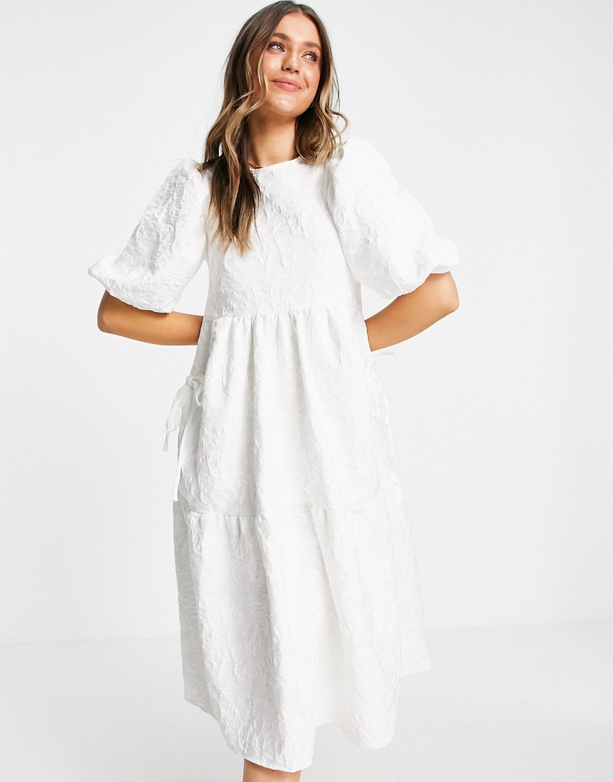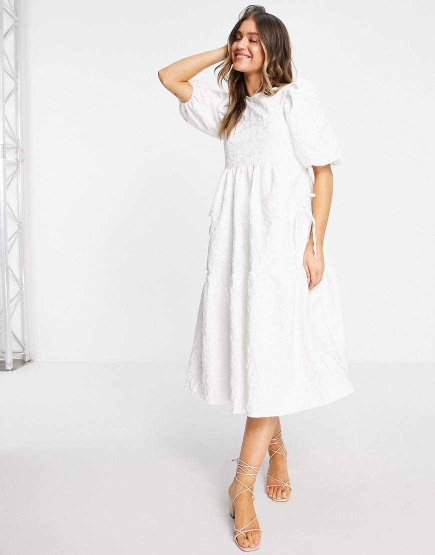 Biała żakardowa warstwowa sukienka midi z naszytymi wypukłymi kieszeniami 40