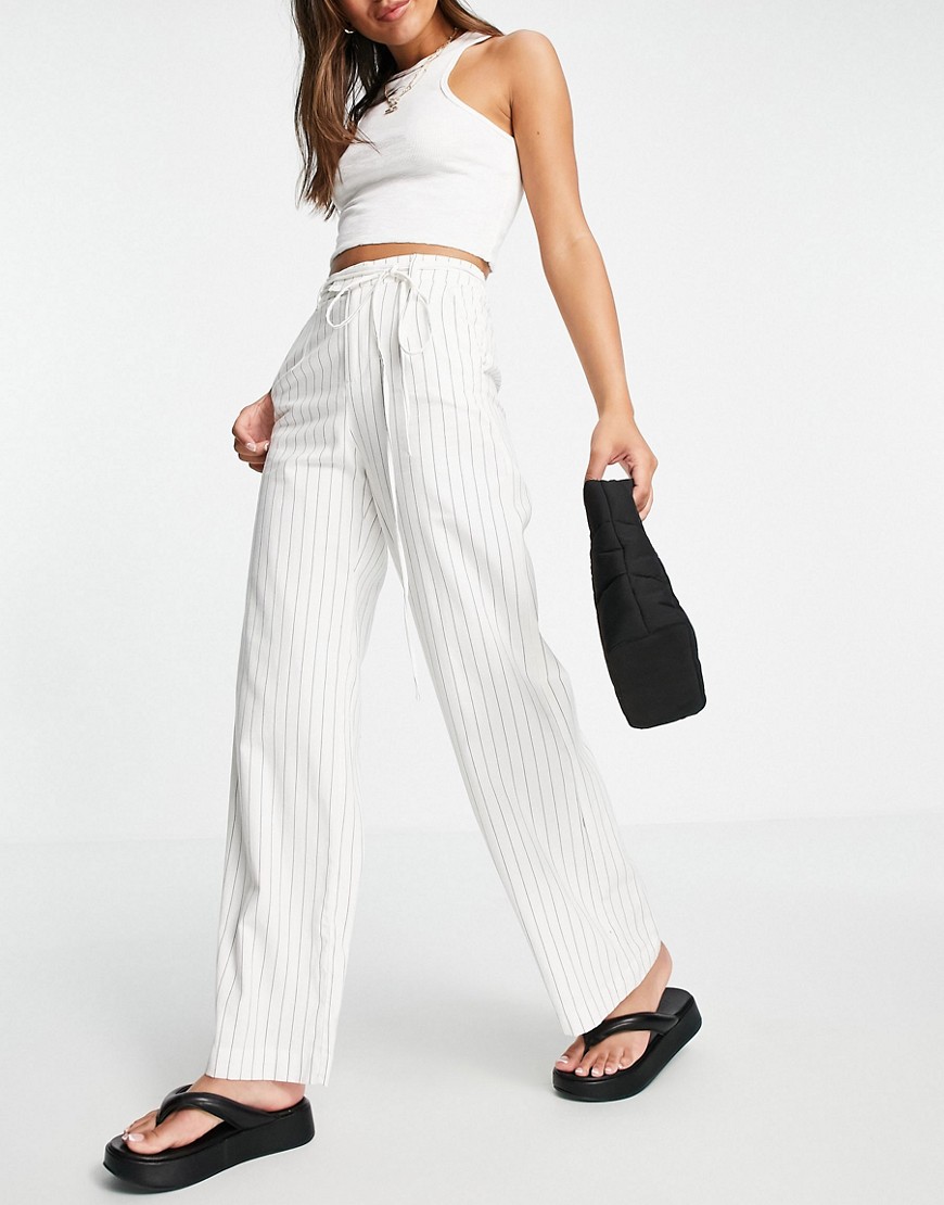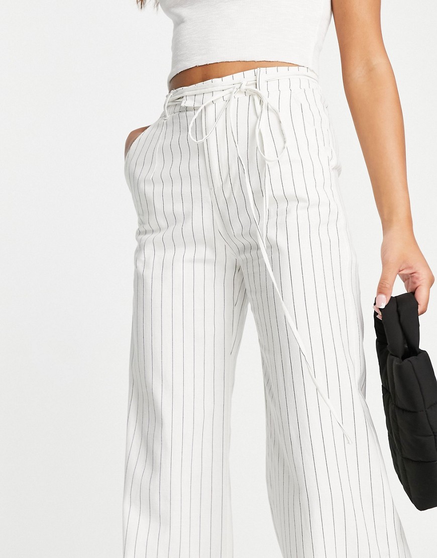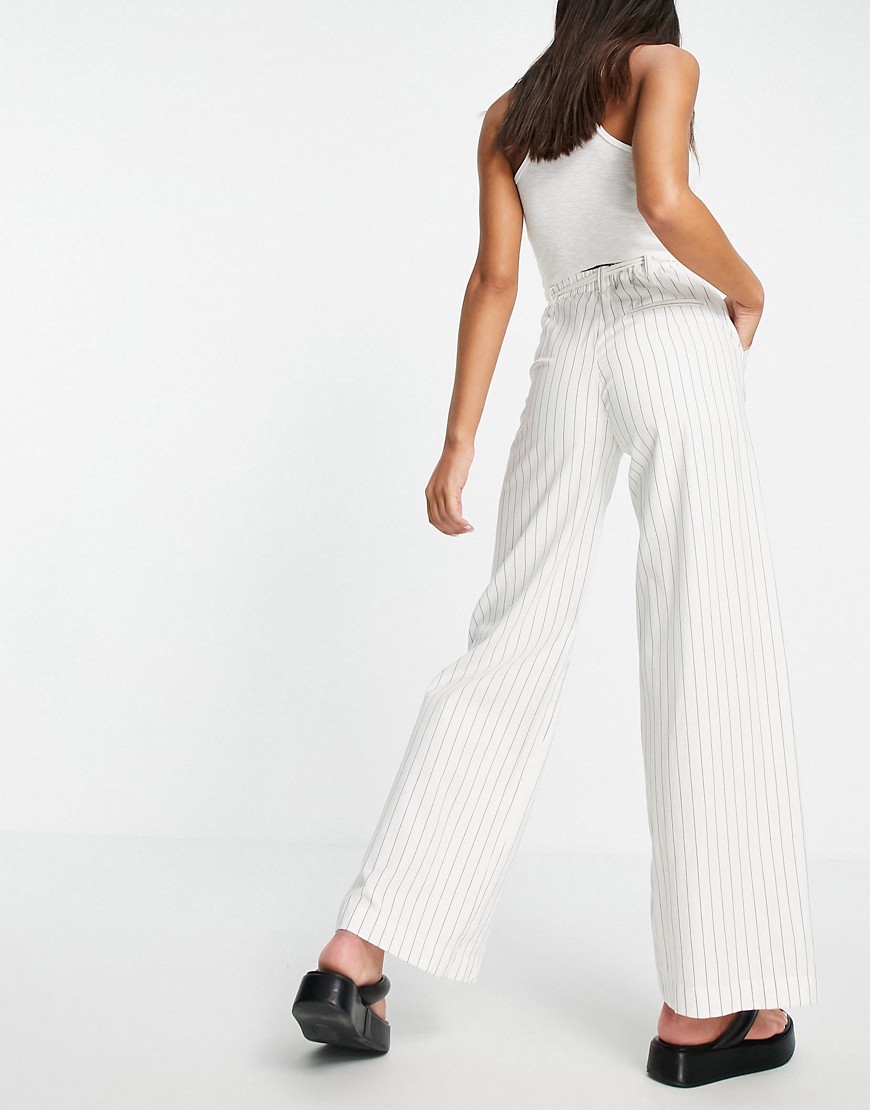 Białe lniane spodnie z szerokimi nogawkami w paski defekt L