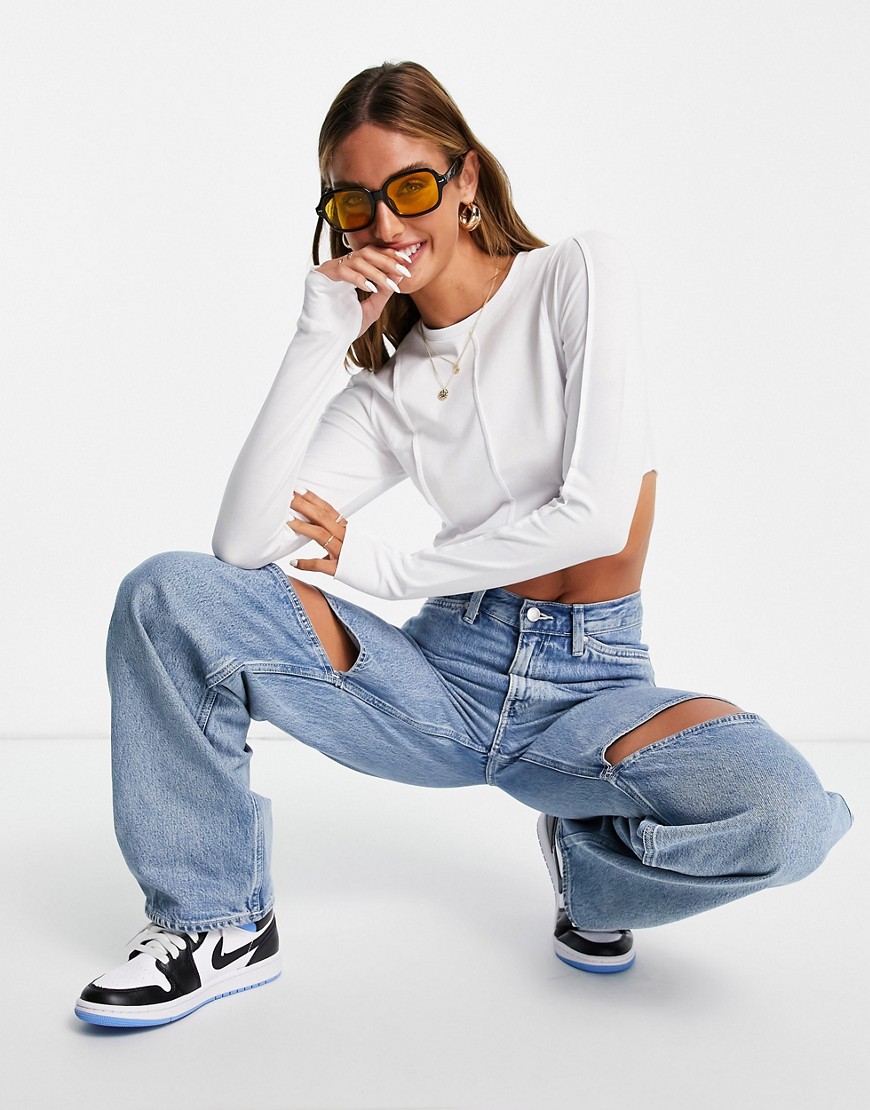 Biały asymetryczny top z ozdobnymi szwami i długimi rękawami 38