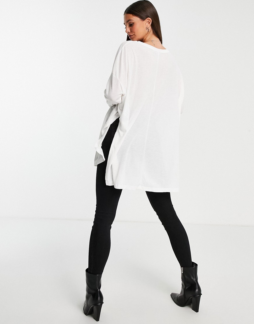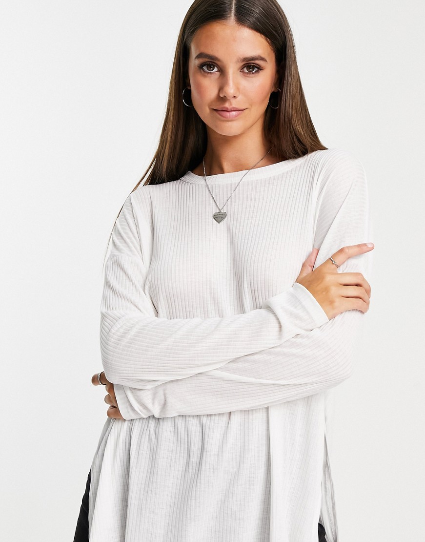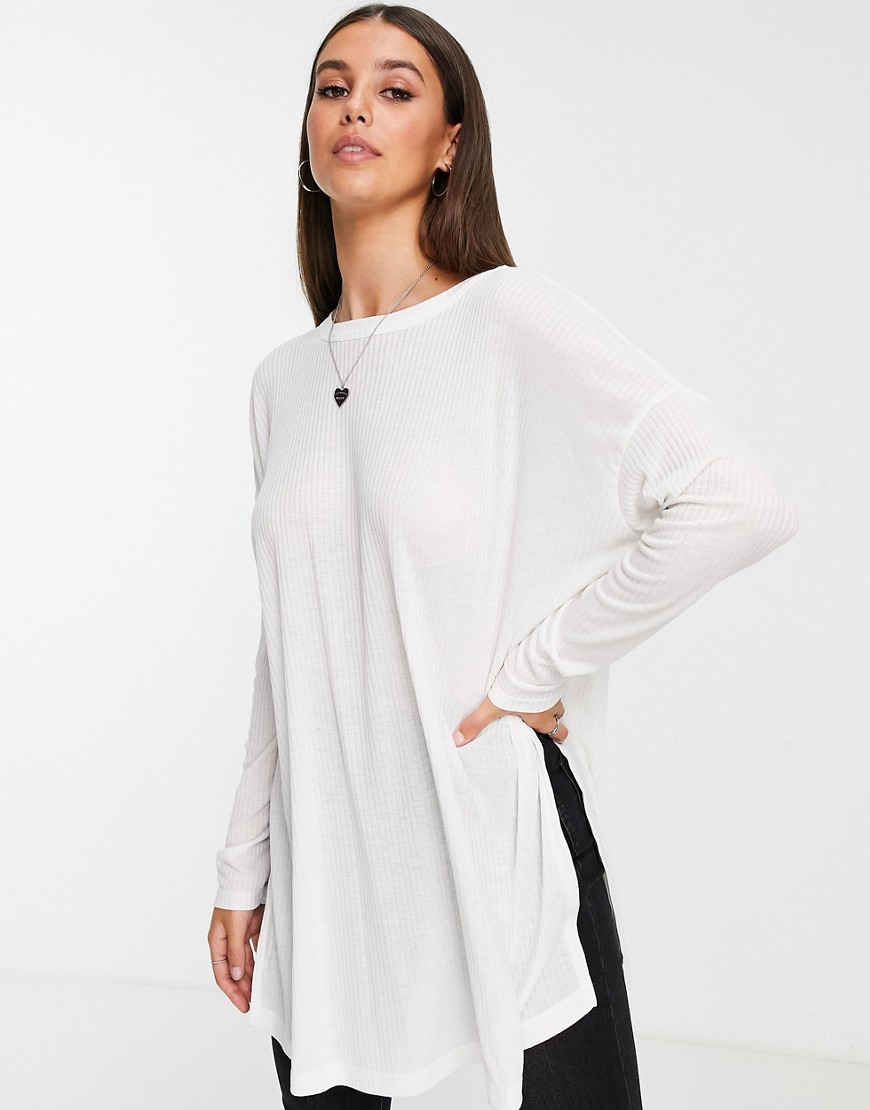 Biały prążkowany t-shirt z długim rękawem i rozcięciami po bokach 38