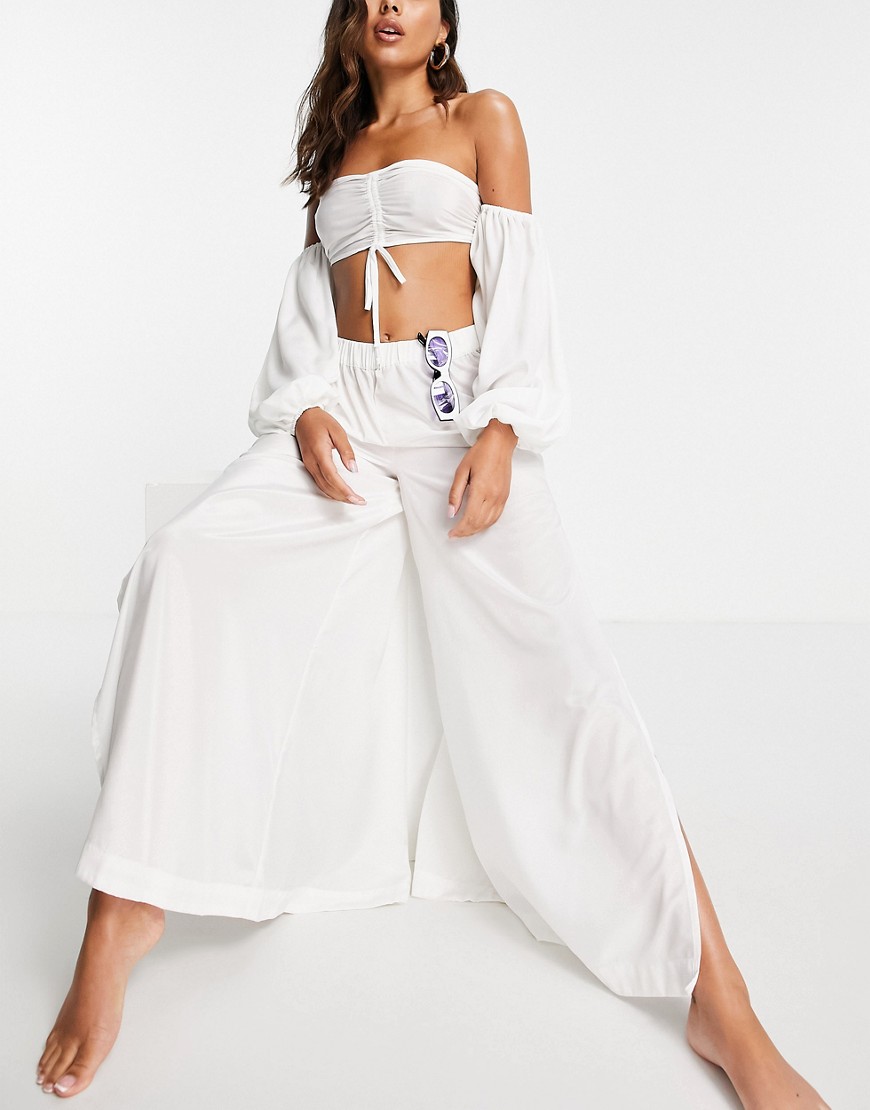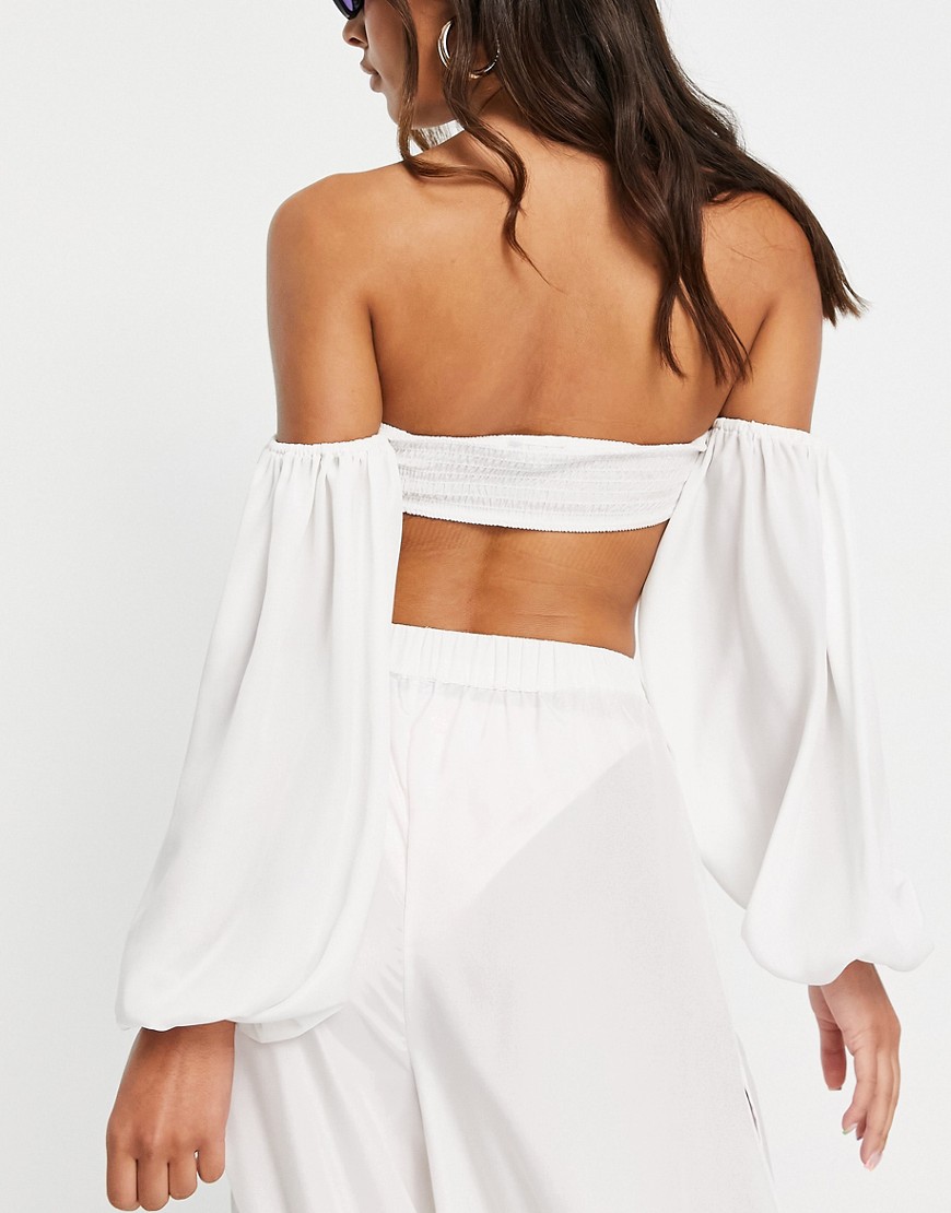 Biały szyfonowy top plażowy odsłonięte ramiona długi rękaw 38