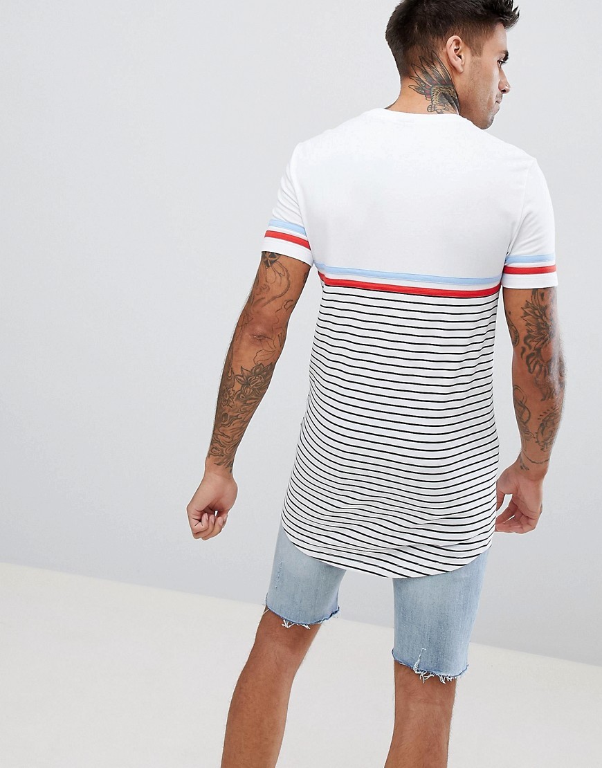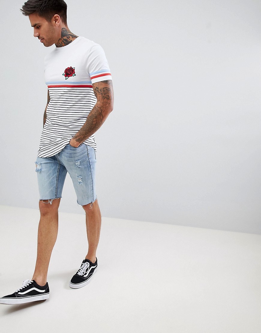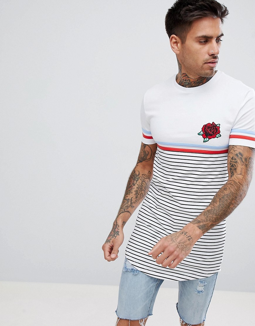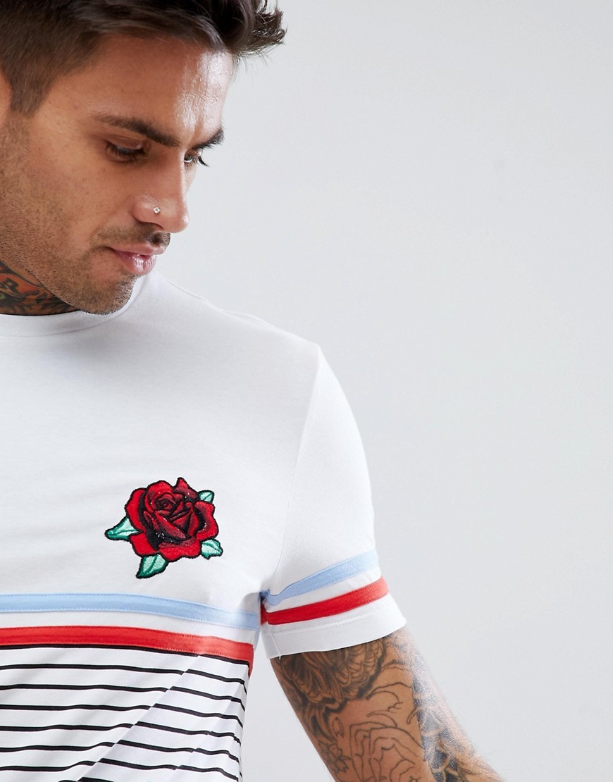 Biały T-shirt w paski z różą długi dopasowany XXS