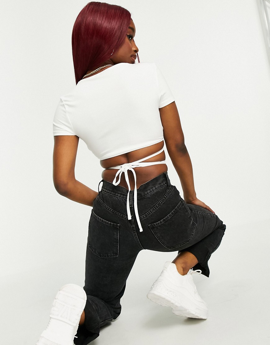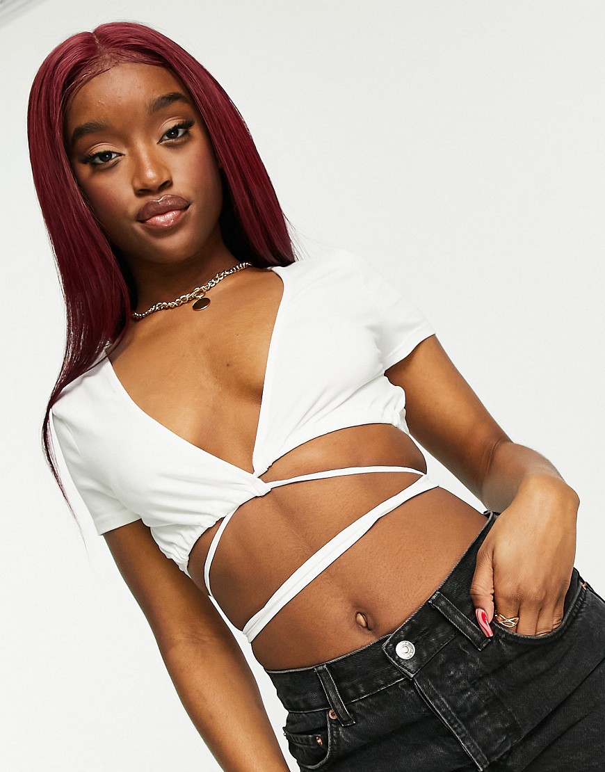 Biały wiązany kopertowy top z głębokim dekoltem i krótkimi rękawami 34