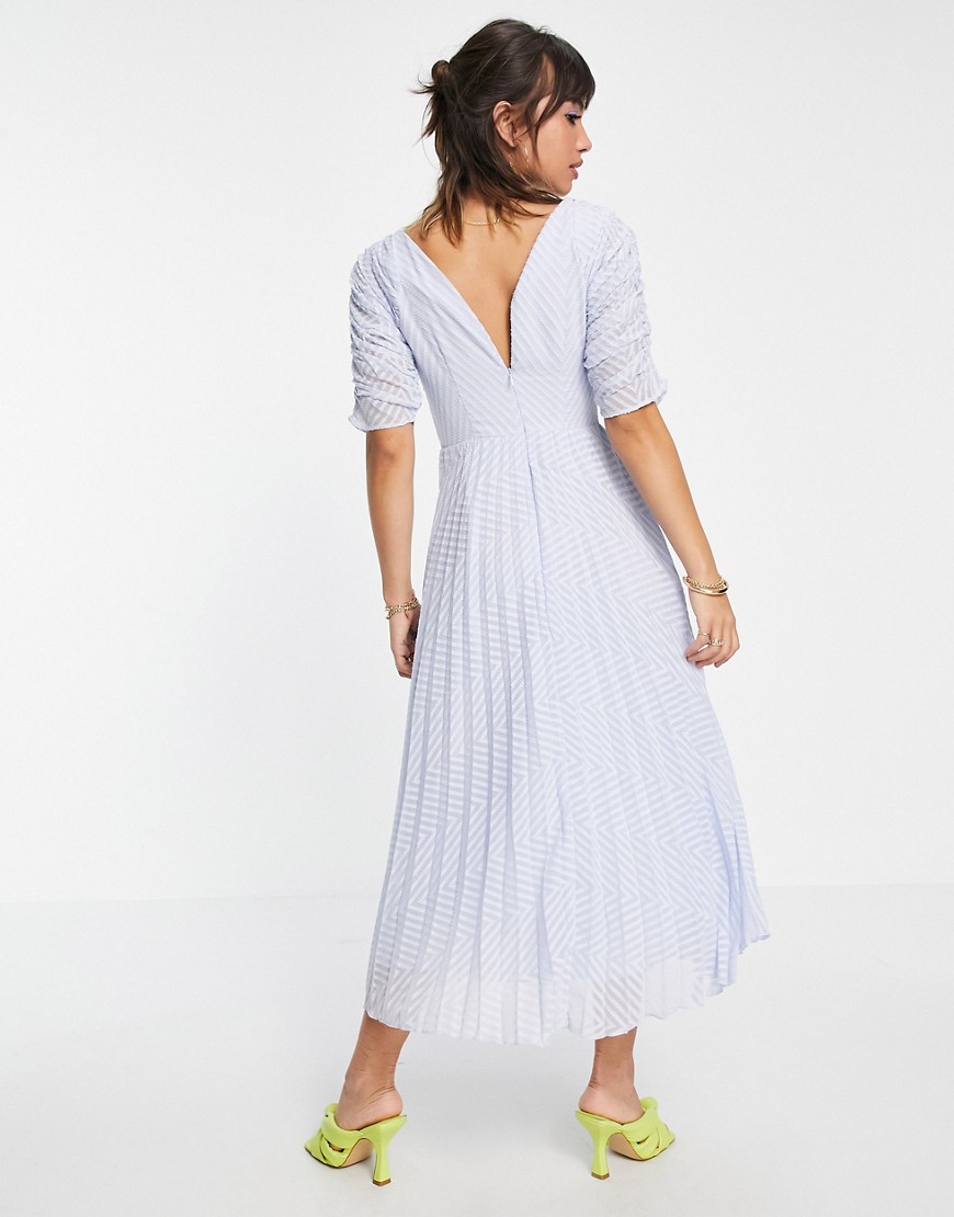 Bladoniebieska plisowana sukienka midi w jodełkę z marszczeniem w talii 46