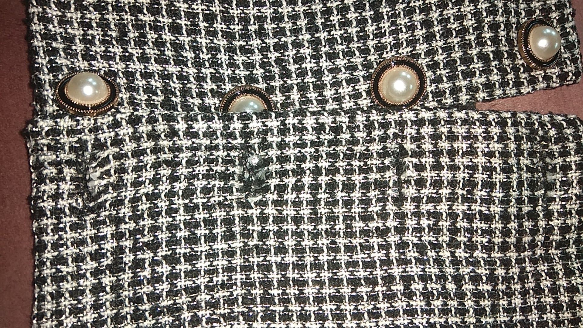 - Defekt: nieobrobione dziurki od guzików, wysnuty materiał (Zdjęcie)