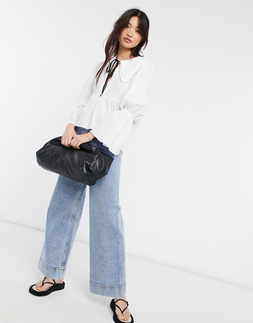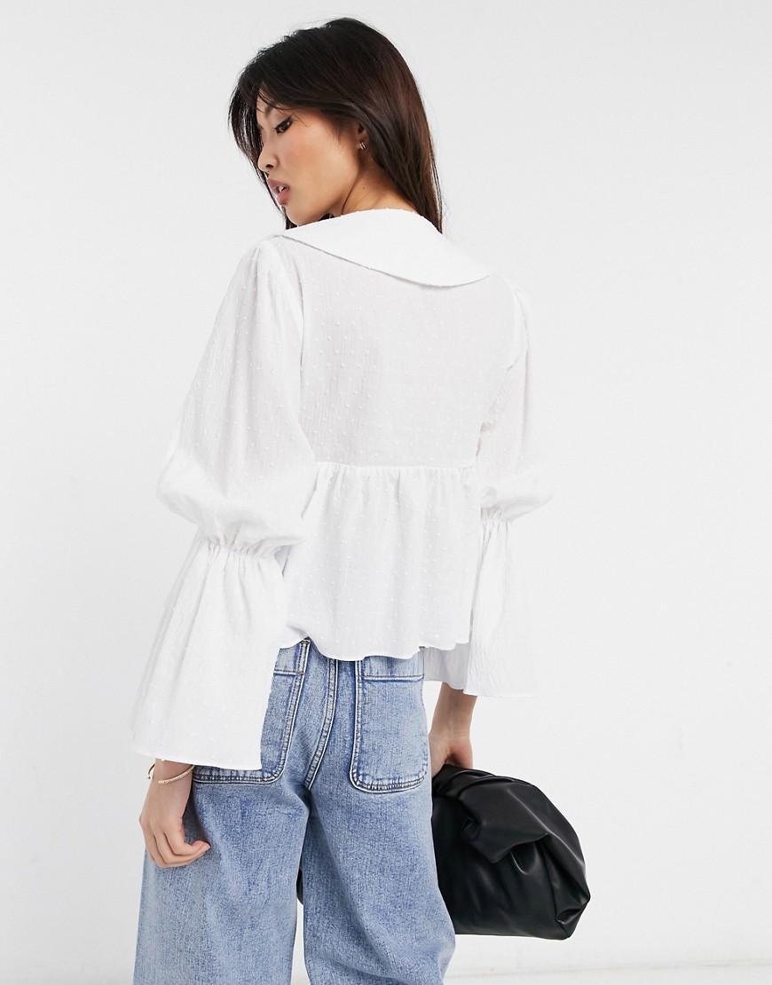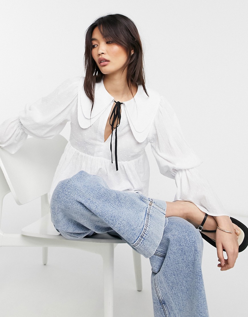 Bluzka z bawełny dobby z kołnierzykiem i wiązaniem przy dekolcie ivory 38