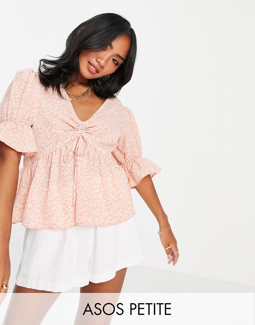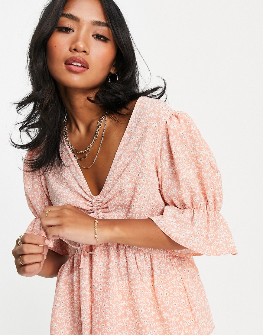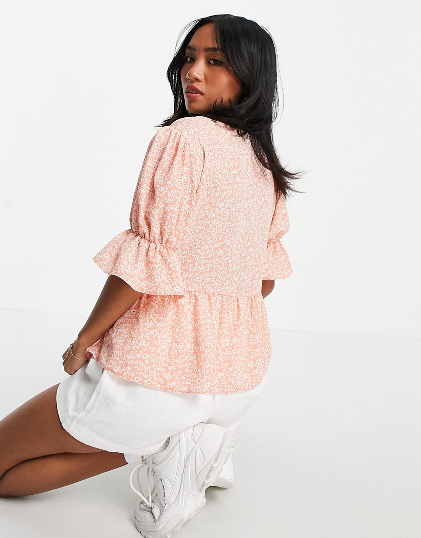 Bluzka z marszczeniem bufkami i baskinką w kwiaty pomarańczowa 42