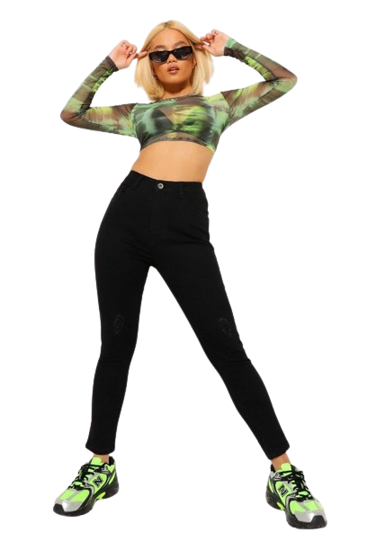 Boohoo czarne jeansy shinny fit z wysokim stanem i przetarciami 34
