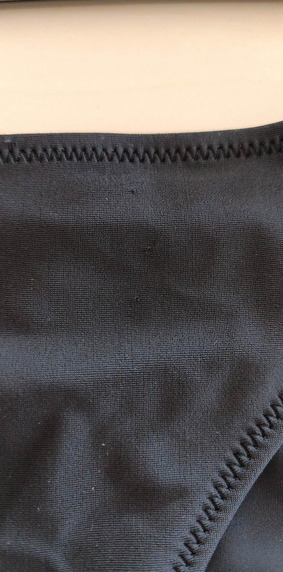 - defekt zaciągnięcia na materiale z przodu i w okolicach kroku