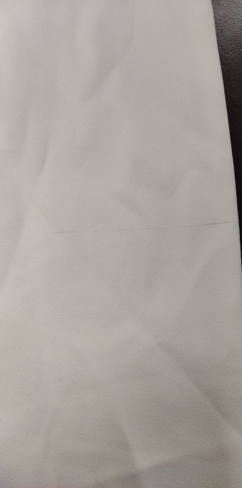 • Defekt: wciągnieta nitka ciemniejszego koloru na wysokości łydki (zdjęcie)