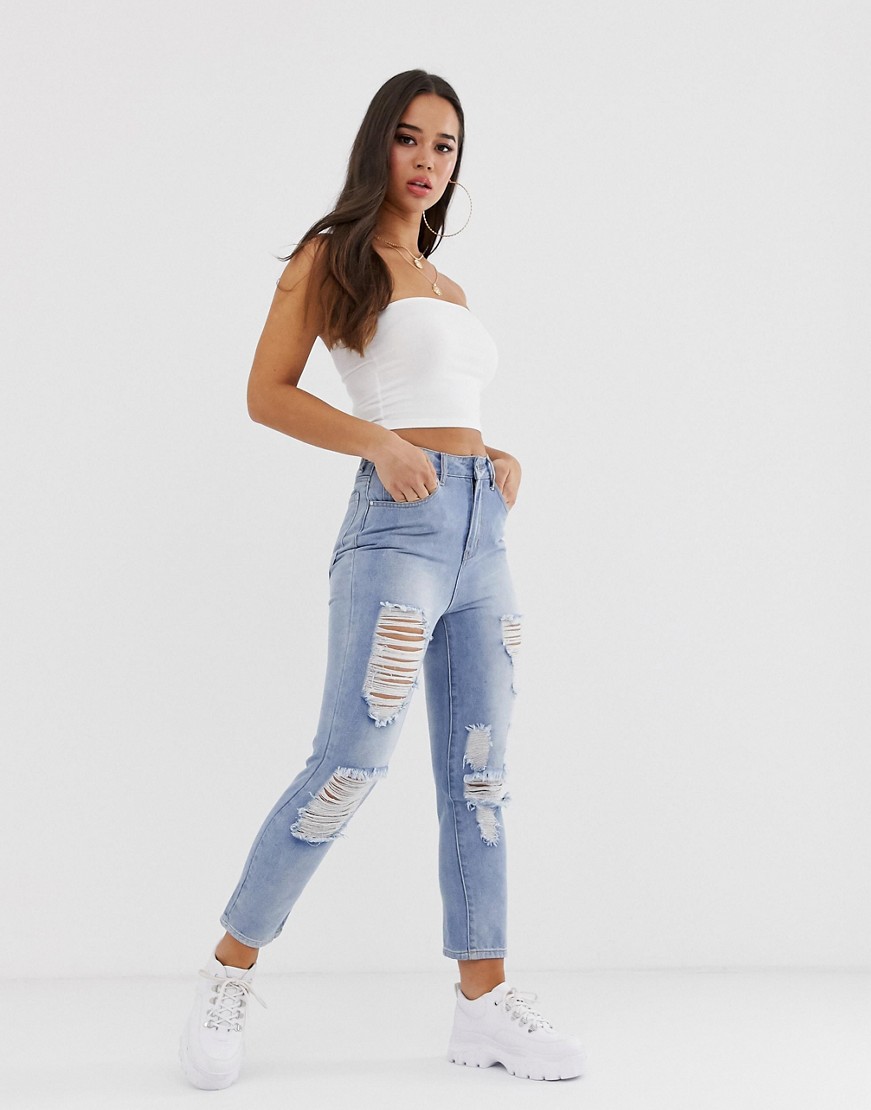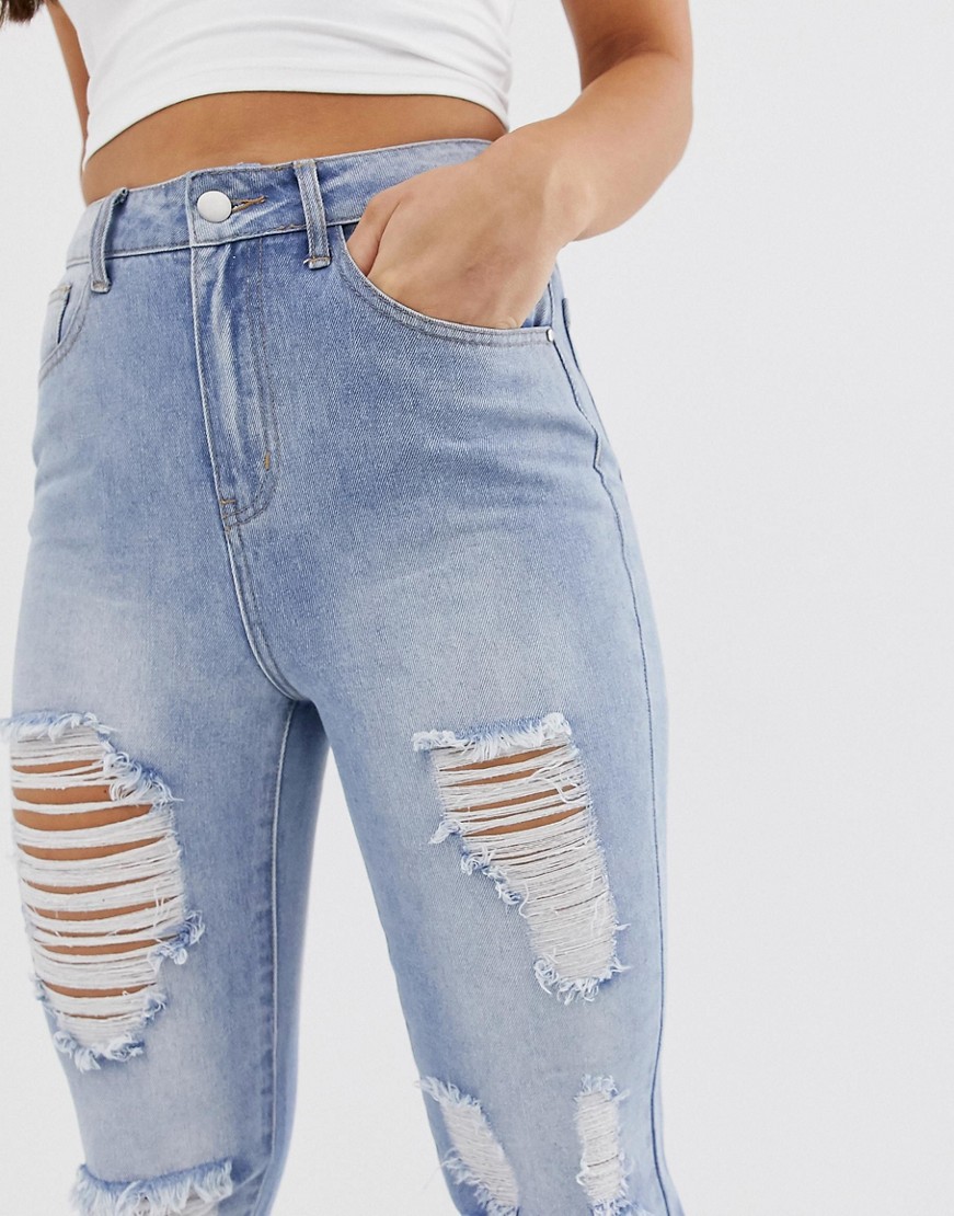 Boohoo Damskie spodnie jeansowe w kolorze niebiskim z dziurami 36