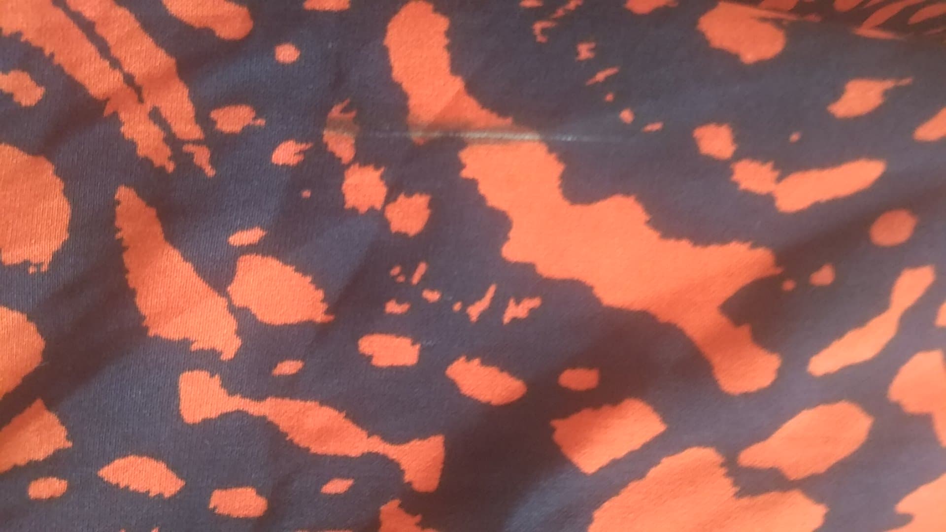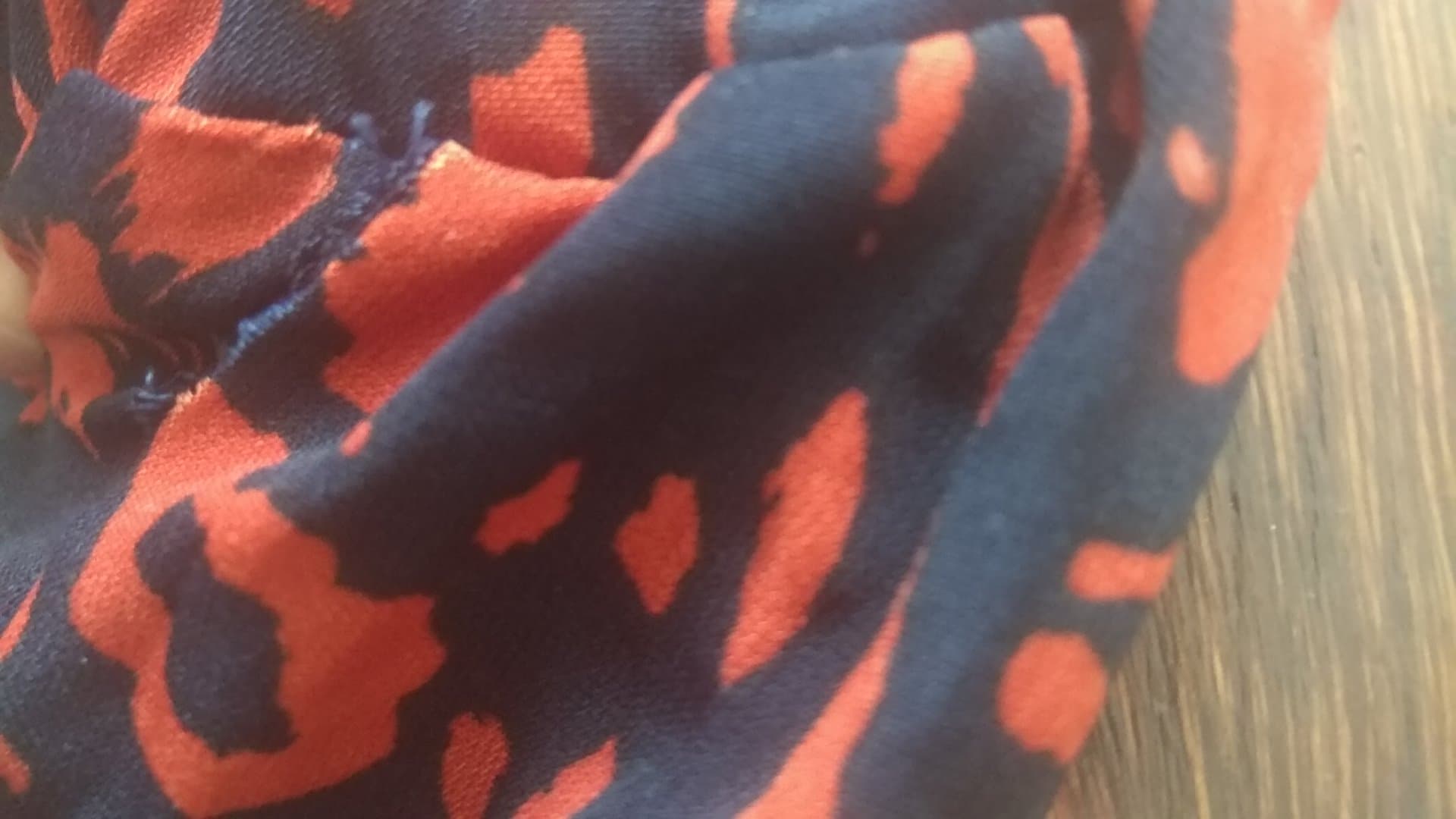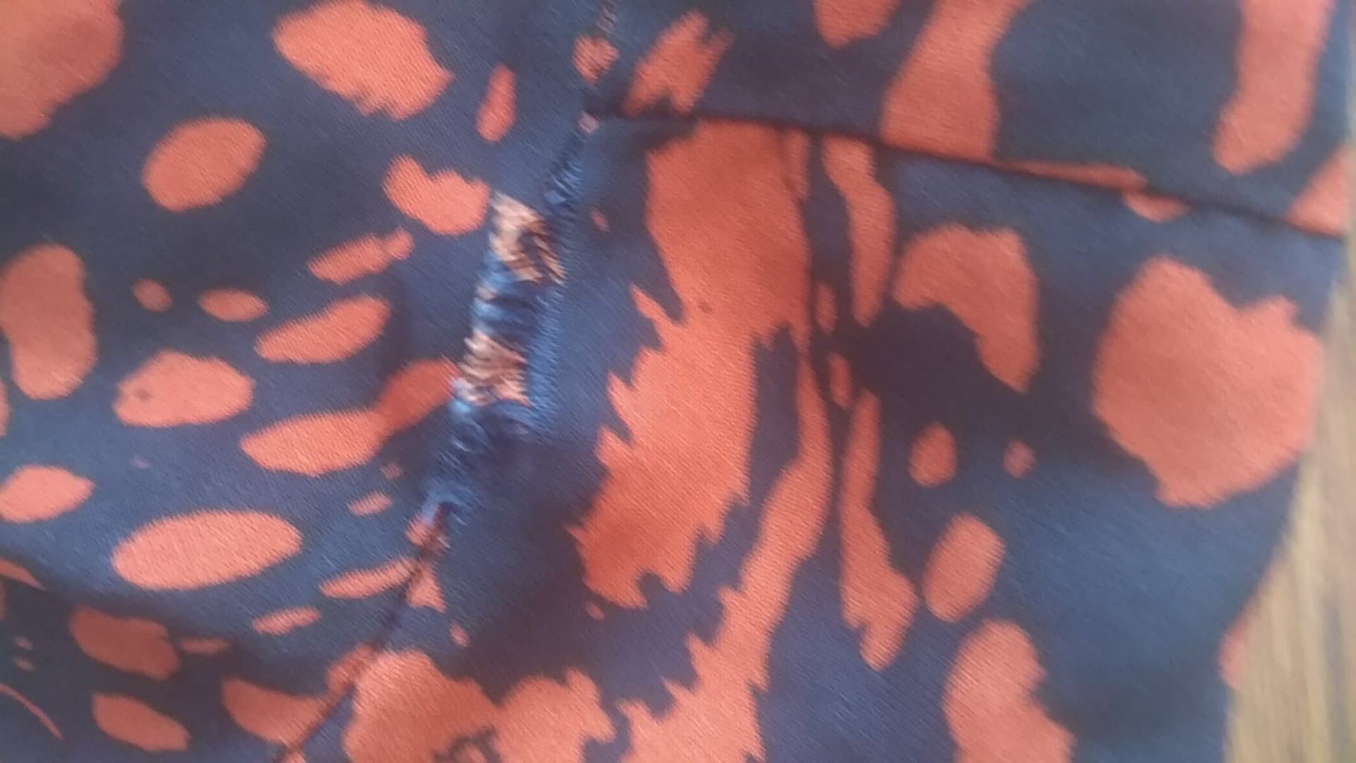 - Defekt: skaza na prawym kolanie (zdjęcie) pęknięcie na szwie na biodrze oraz ramieniu (zdjęcia) do korekty krawieckiej