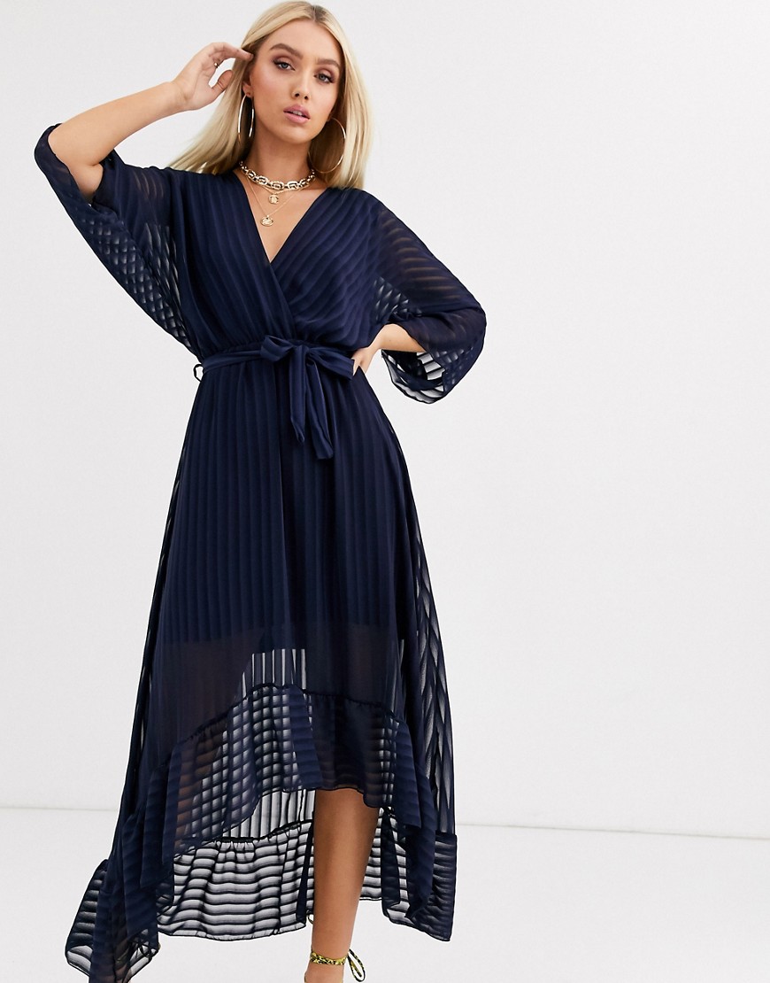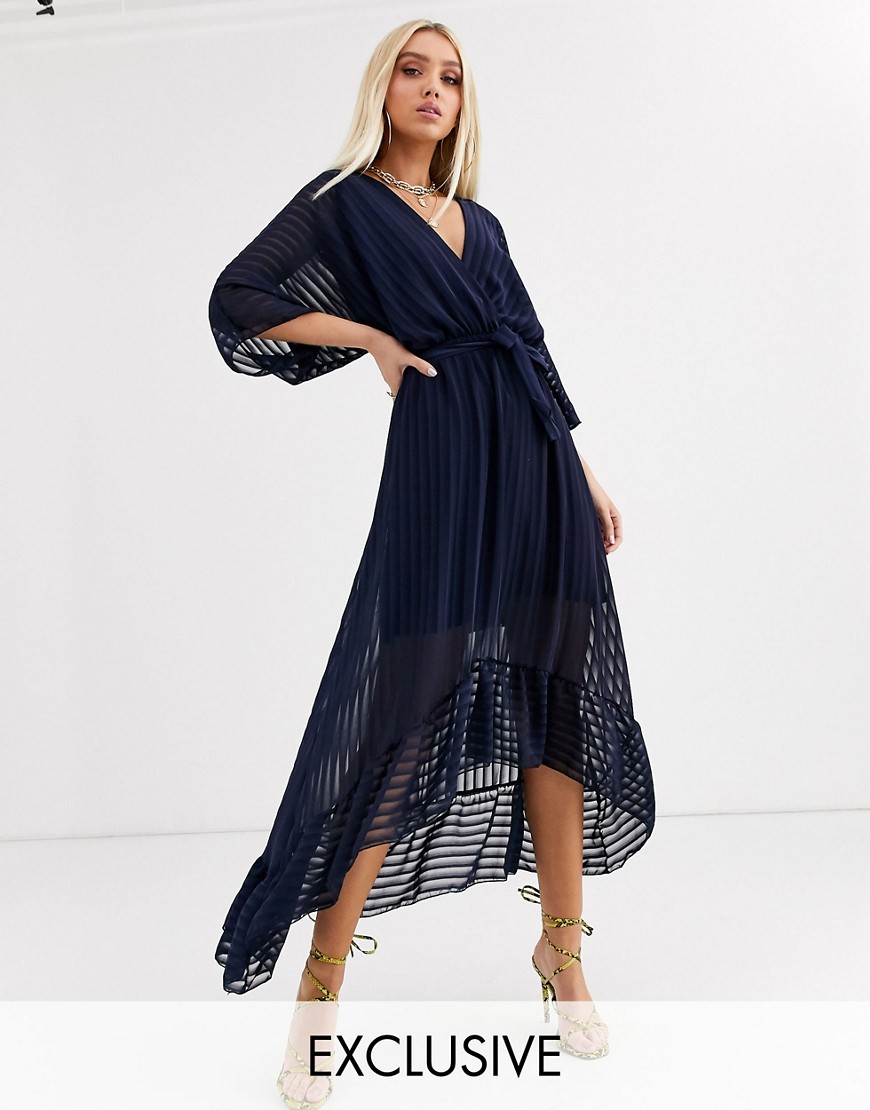 Boohoo Granatowa sukienka z głebokim dekoltem i falbana u spodu 42