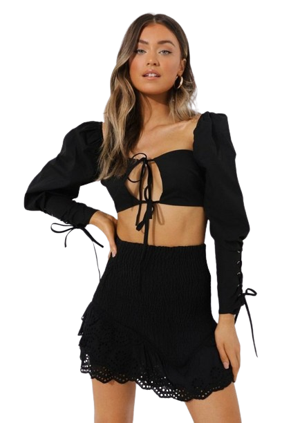- Bufiaste, długie rękawy ze sznurowaniem