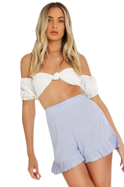 Boohoo letnie niebieskie szorty w groszki z falbanką 38