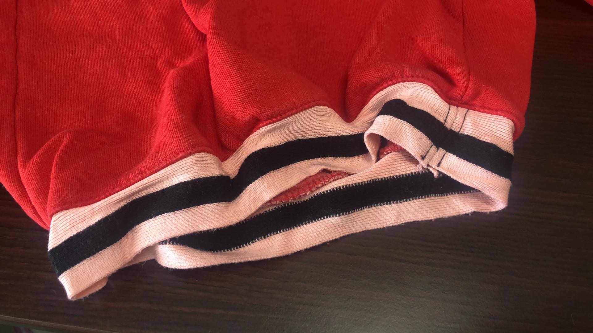- Defekt: zabarwione, rozciągnięte ściągacze przy nogawkach, zdjęcie w galerii