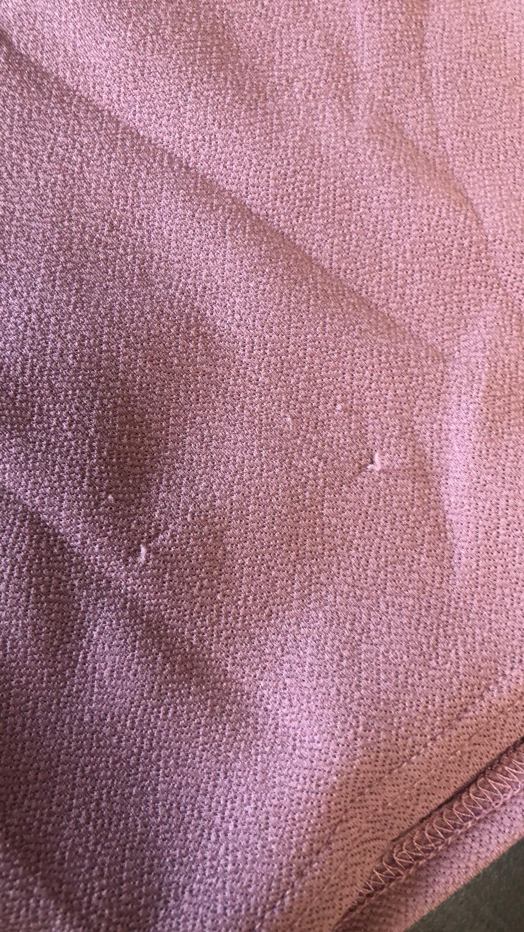 - Defekt: zaciągnięcie materiału na dole z przodu, po dwóch bokach, zdjęcie w galerii
