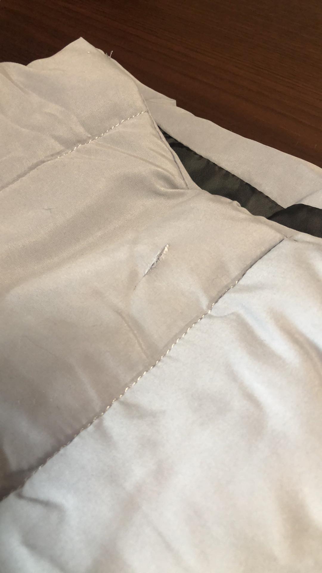 - Defekt: przecięty materiał z przodu koło ramienia, zdjęcie w galerii