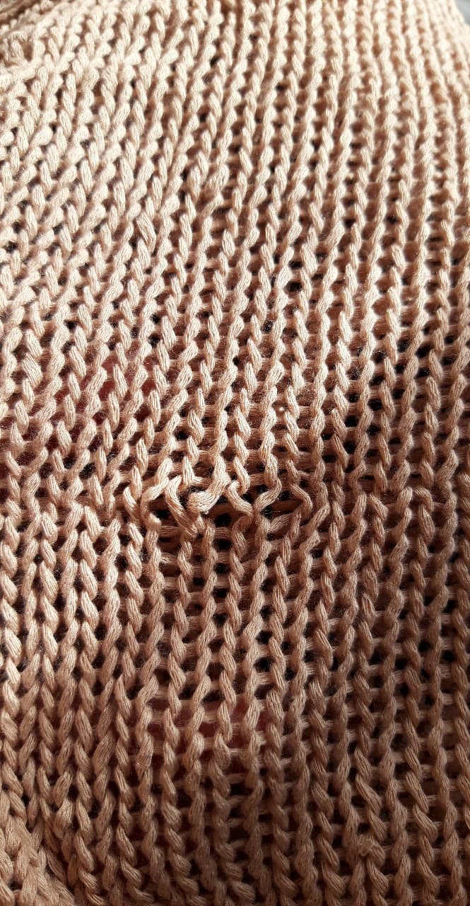 - DEFEKT: rozciągnięta dzianina z przodu po lewej stronie (zdjęcie) Rozciągnięte oczka wyglądają jak dziury