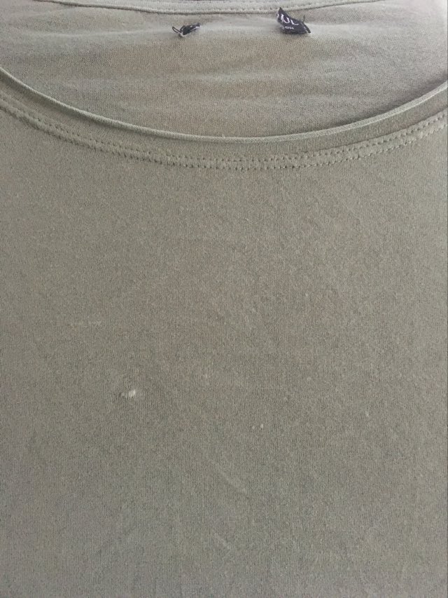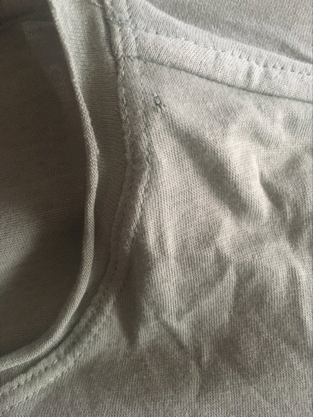 - Defekt: zgrubienie materiału i odbarwienie w tym samym miejscu, mała dziurka przy dekolcie po lewej stronie (zdjęcia).