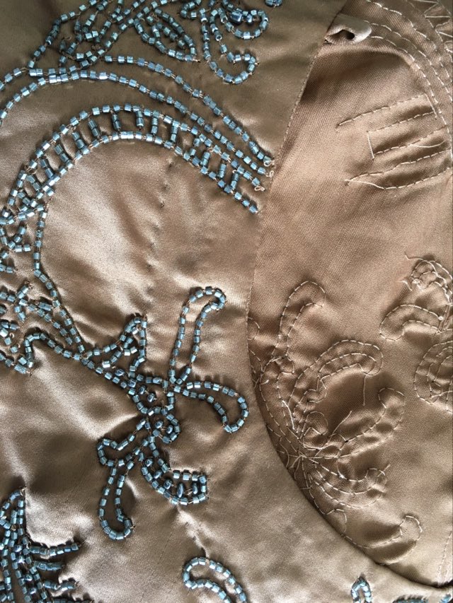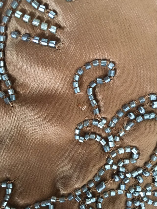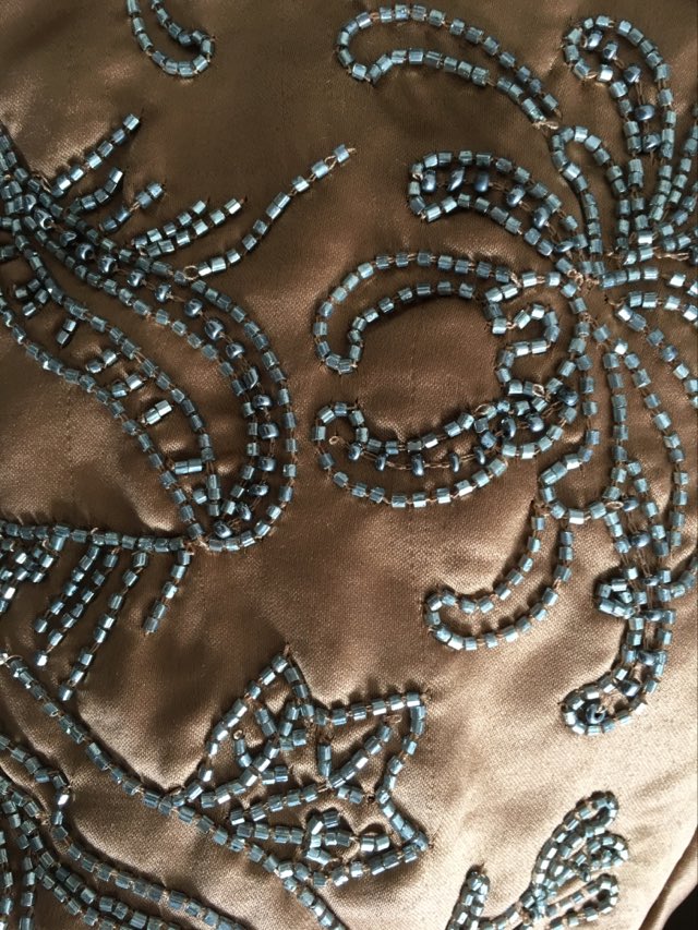 - Defekt: delikatne zaciagnięcia materiału często występujące w tego typu tkaninie oraz miejscowe drobne braki z zdobieniu – defekty są mało widoczne (zdjęcia).