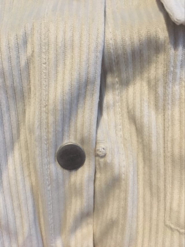 • Defekt: wyrwany 4 guzik od góry – zdjęcie w galerii przedmiotu.
