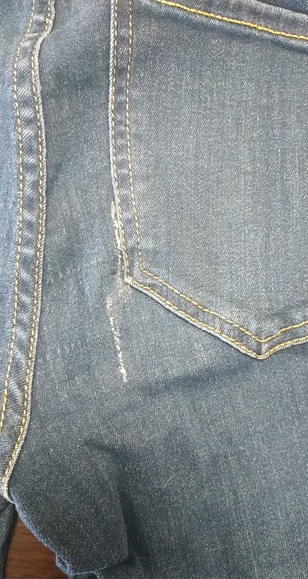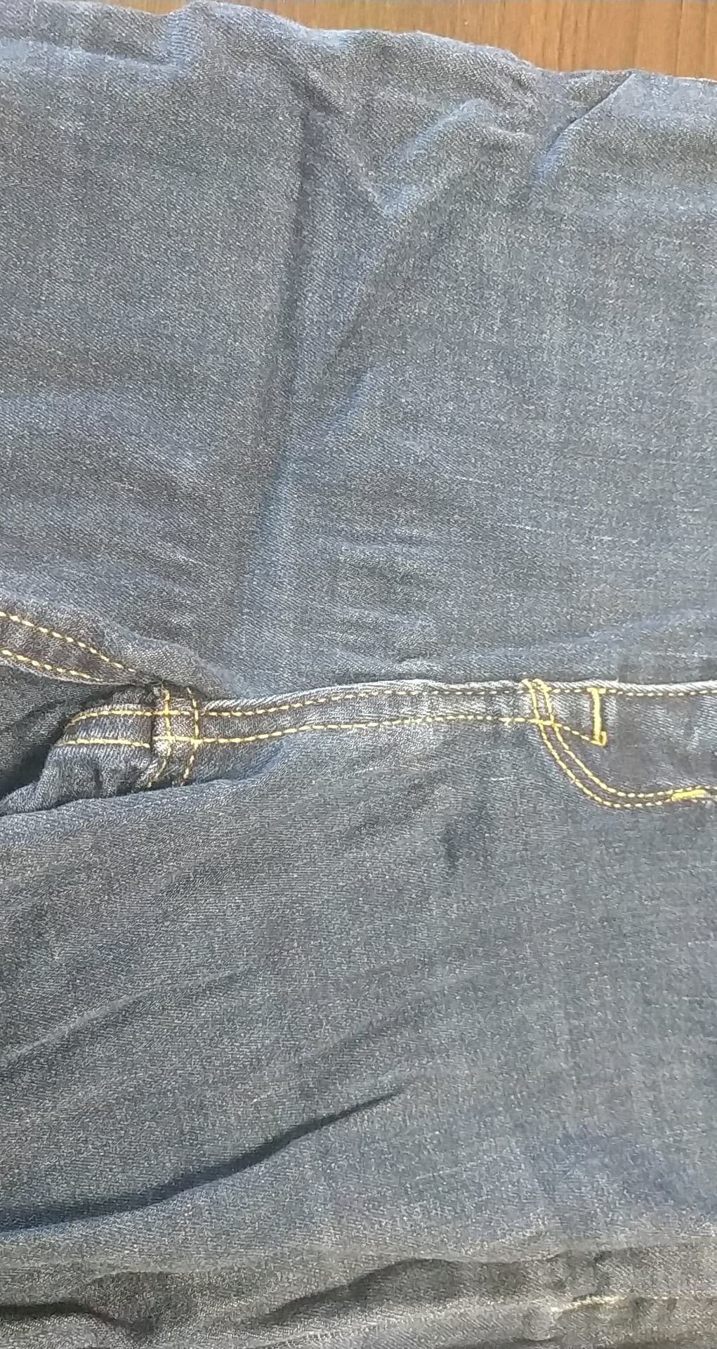 - defekt rozdarcie z tyłu przy prawej kieszeni, rozciągnięty materiał z przodu na wysokości kroku