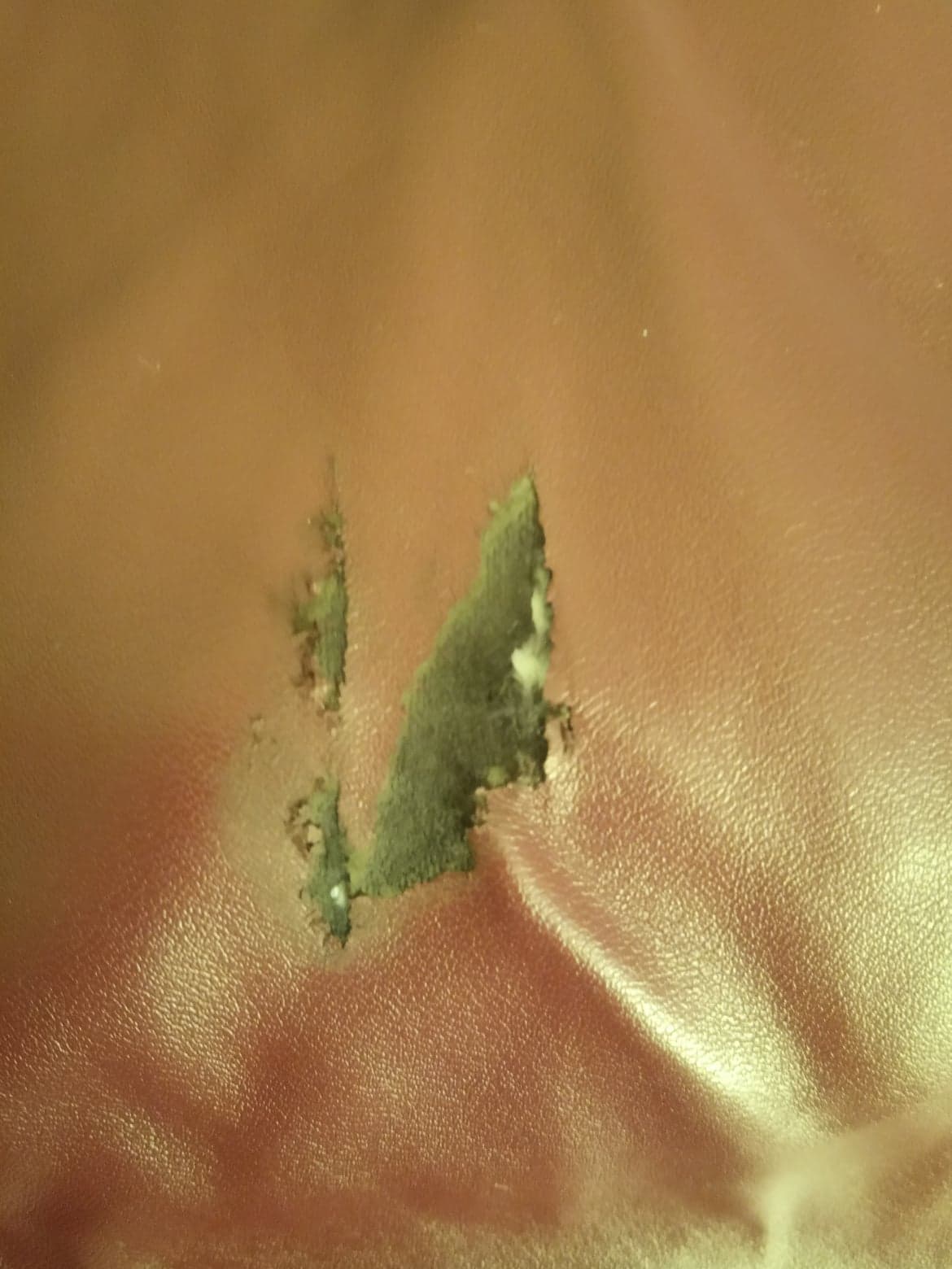 - Defekt: przetarcie/dziura u dołu z lewej strony (zdjęcie)