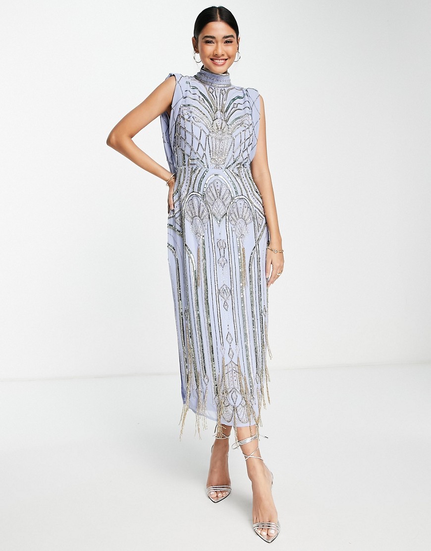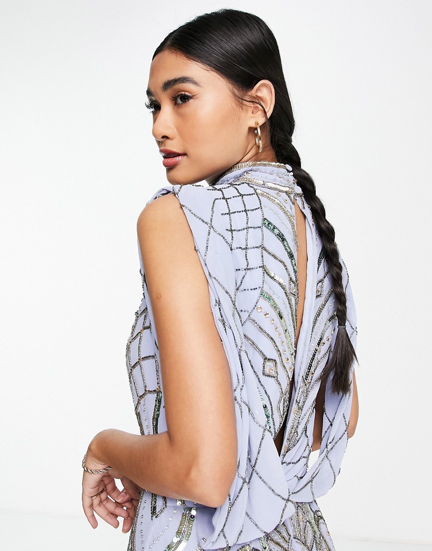 Cekinowa sukienka midi z drapowaniem z tyłu niebieska 44