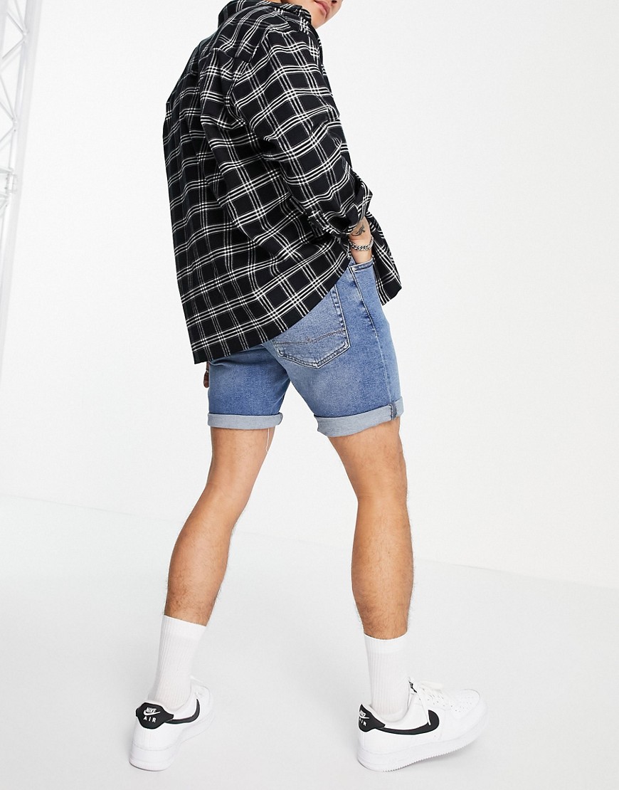 Ciemnoniebieskie dopasowane szorty jeansowe męskie z efektem sprania W32