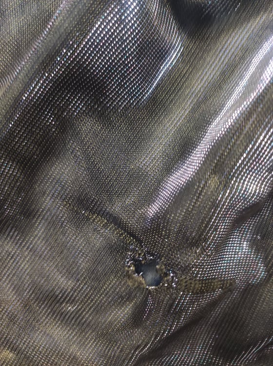 - Defekt: dziura i zaciągnięcie na wierzchniej warstwie sukienki u dołu na dłuższej asymetrycznie części. Dziua jest z przodu (zdjęcie)