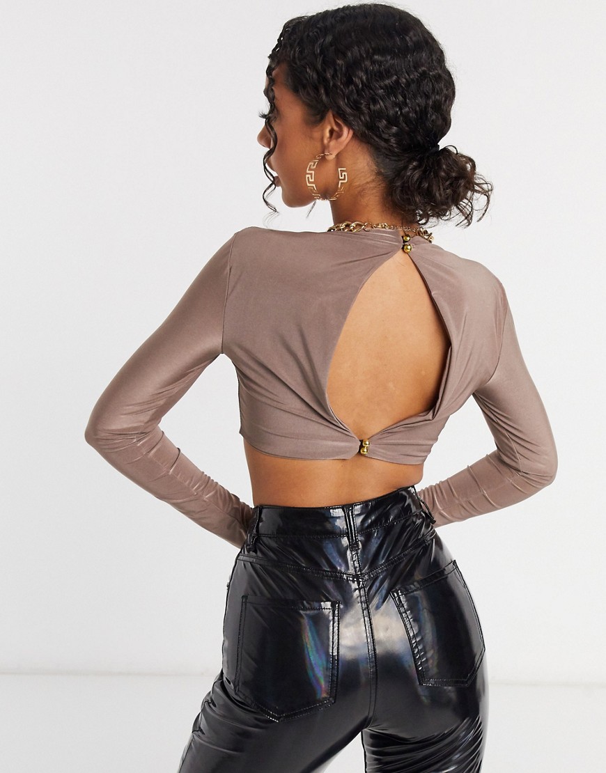 Club L London Szarobrązowy krótki top z długim rękawem, część zestawu 44