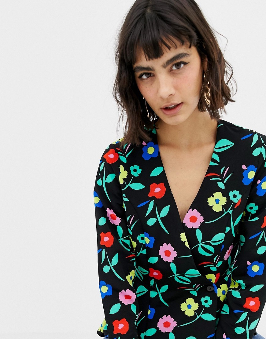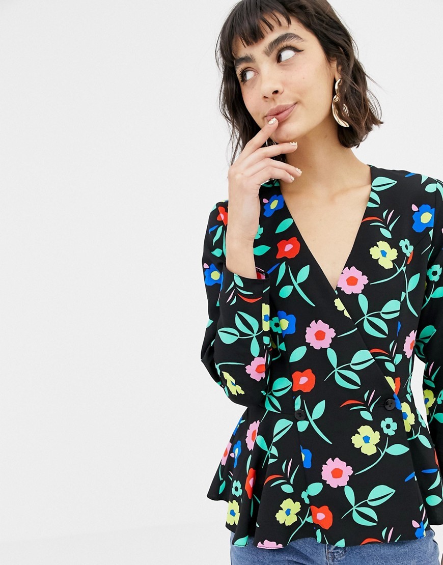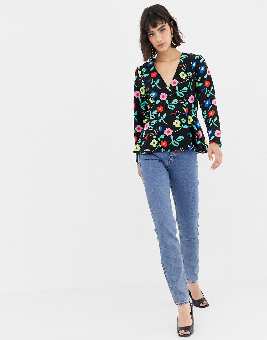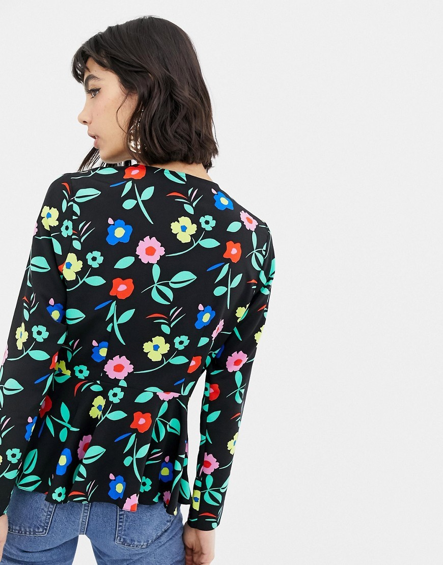 Czarna Bluzka z długim rękawem print w kwiaty M 38