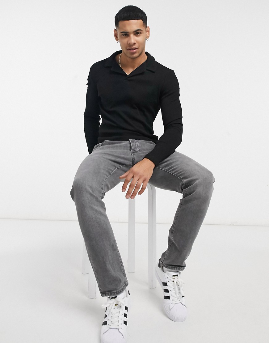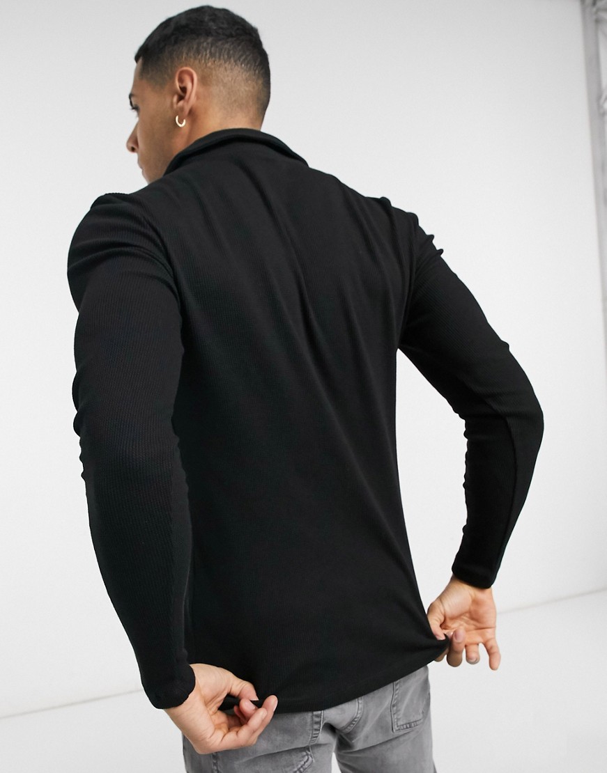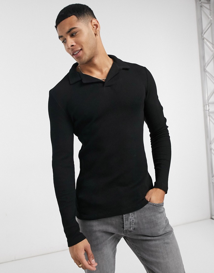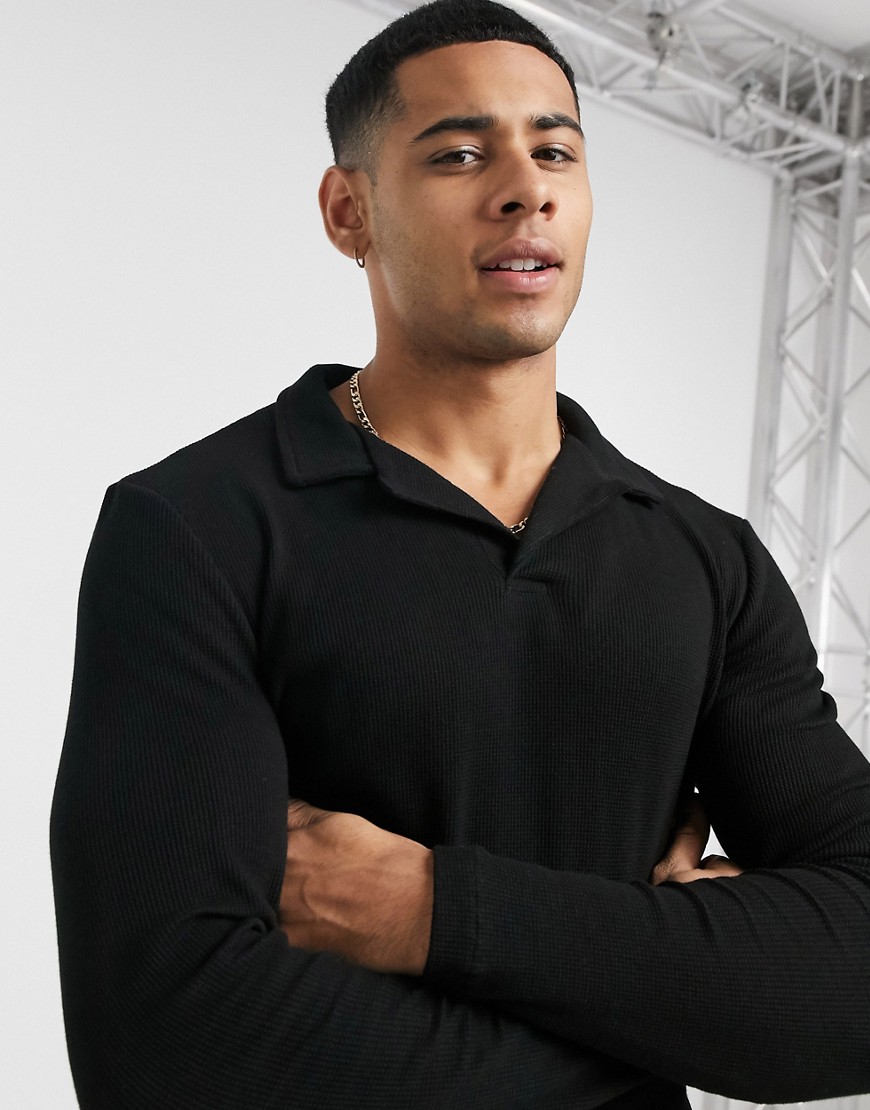 Czarna koszulka polo z kubańskim kołnierzykiem i długim rękawem L