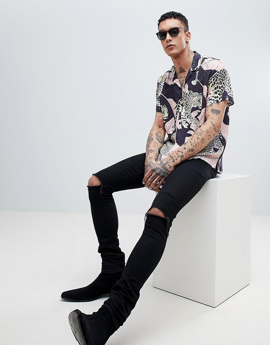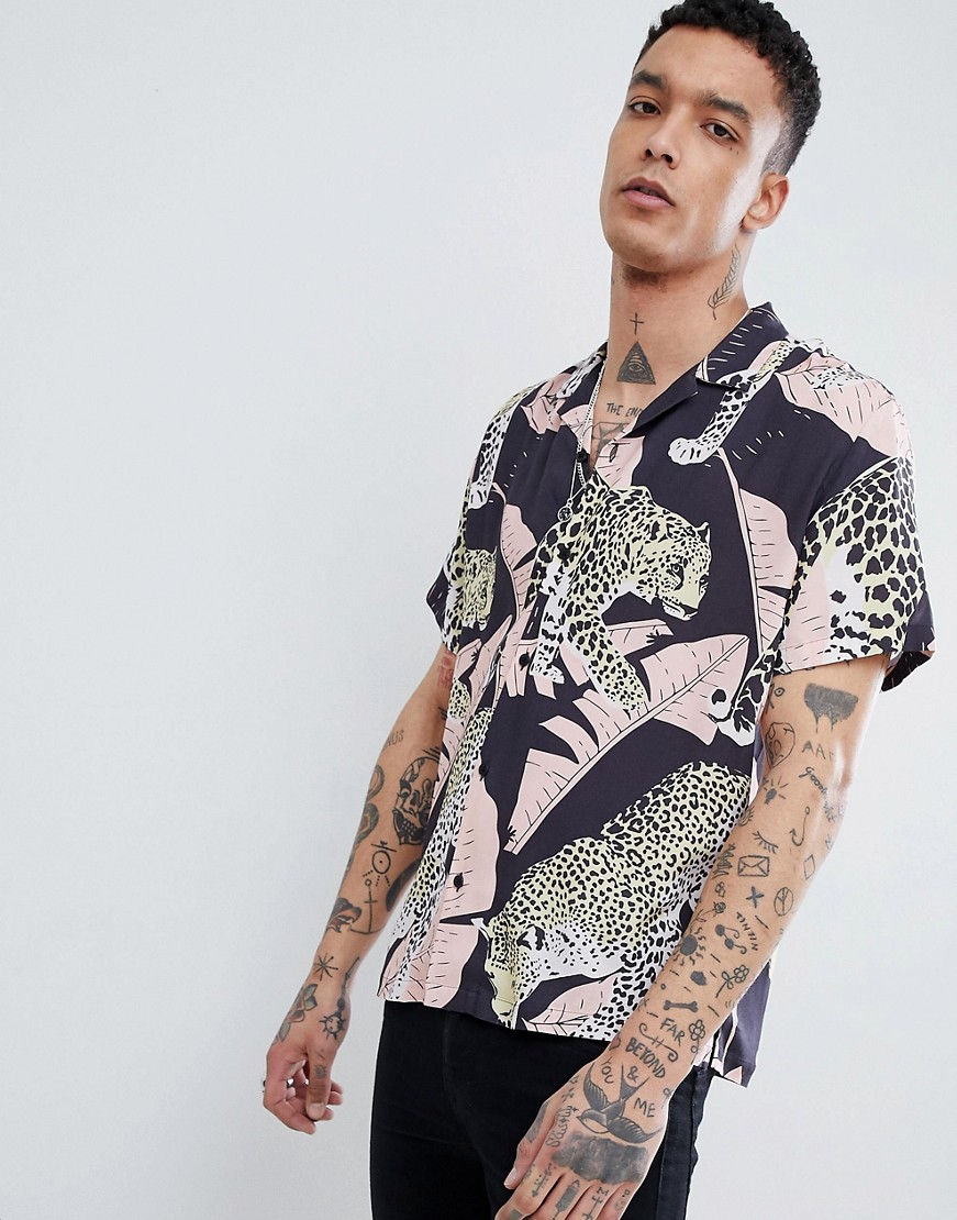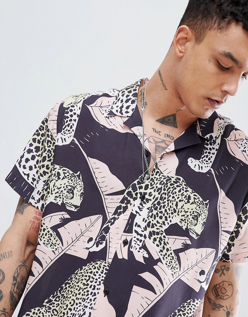 Czarna luźna koszula w panterkę z kołnierzykiem revere defekt M