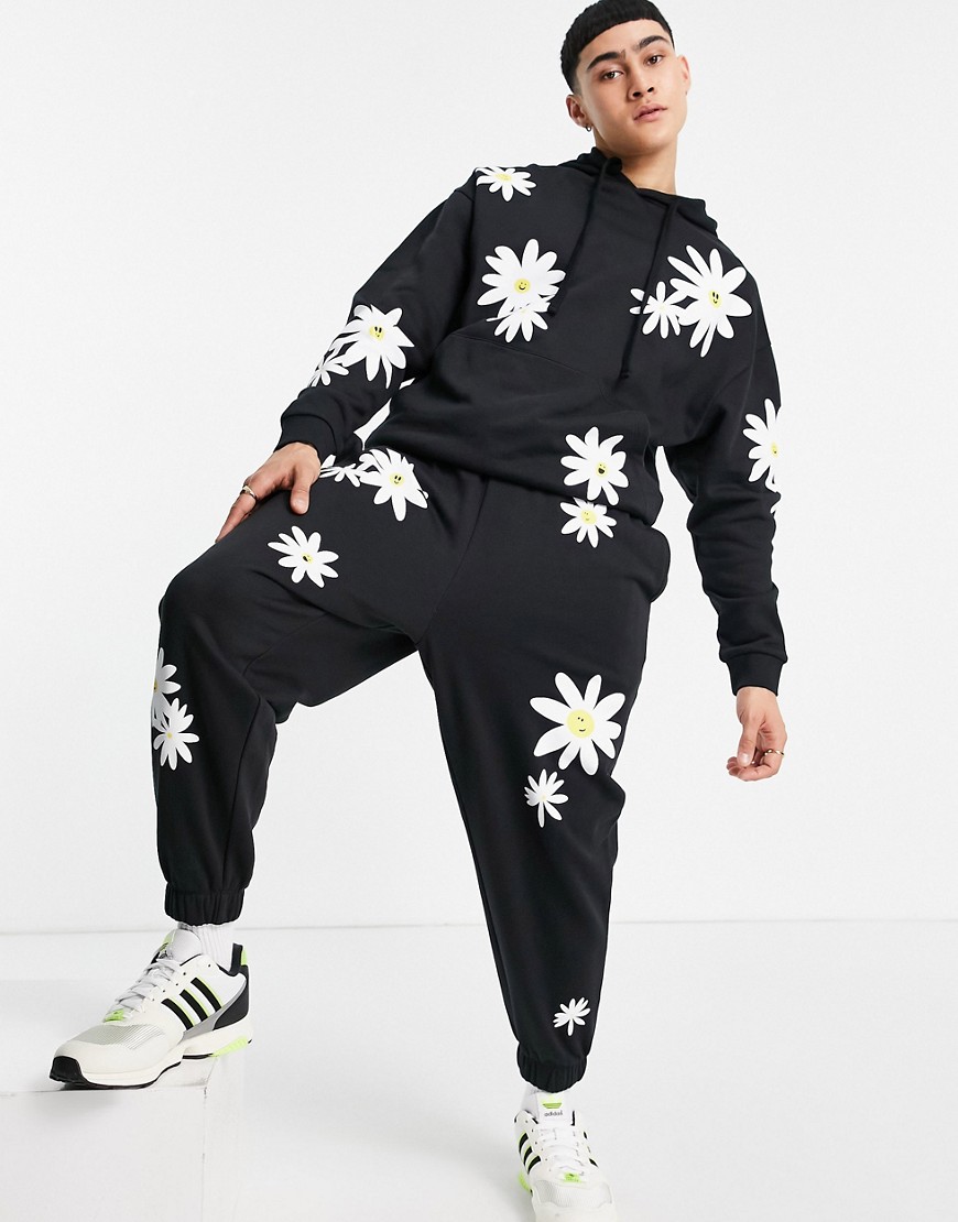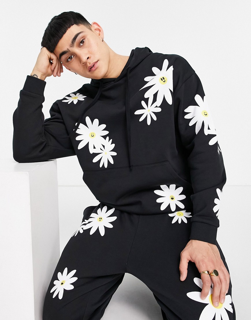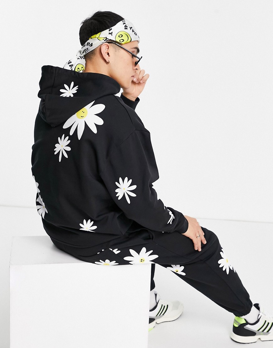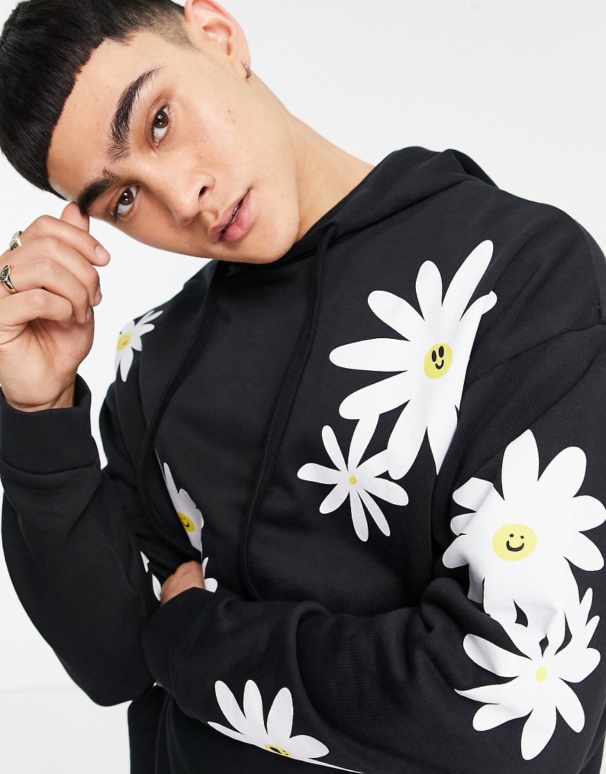Czarna męska bluza oversize z kapturem w stokrotki L